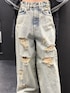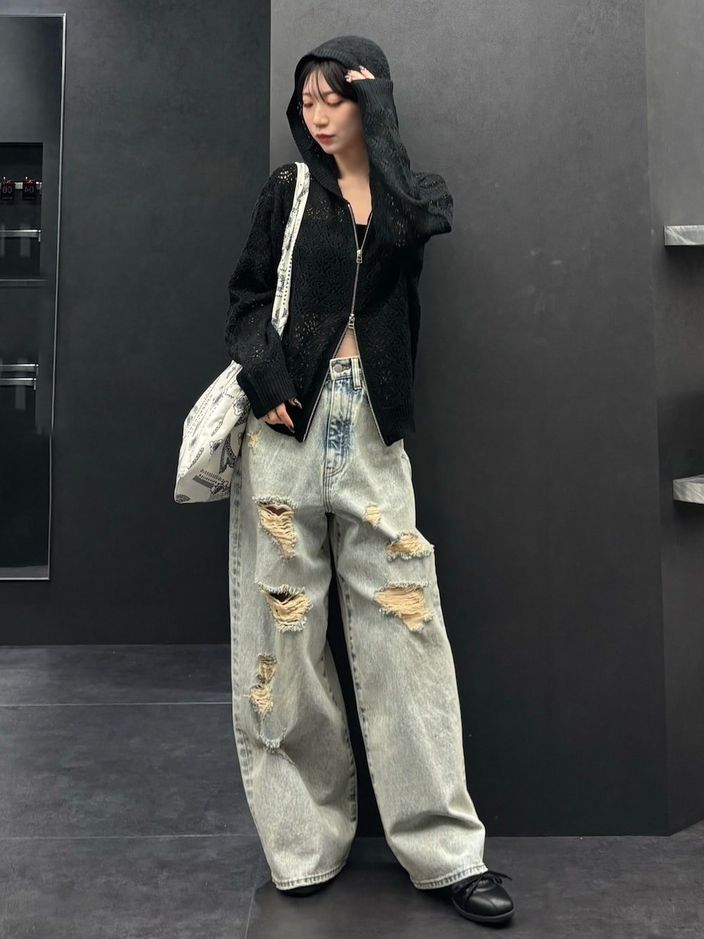 【トップス】シアーで抜け感型フードも大きめで可愛い♥160cmで腰位置ぐらいの丈感です 【ボトムス】程よいダメージで抜け感🙆♀️広めのワイドでダボダボ感欲しい方におすすめ✨ 160cmがローライズ気味で履いて、2cm厚底履いて床に着く丈感です 【シューズ】高さがあまりないから身長高くなりたくないけど、少しは盛りたい方におすすめ🤤クッション性あって歩きやすいです‼️23.5でMサイズ着用