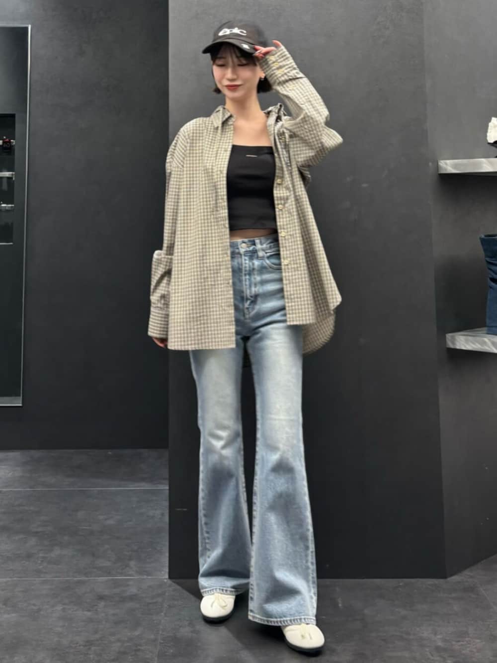 Yuzuki(EMODA)のデニムパンツ「ミニマルジャストウエストフレアデニム」を使ったコーディネート