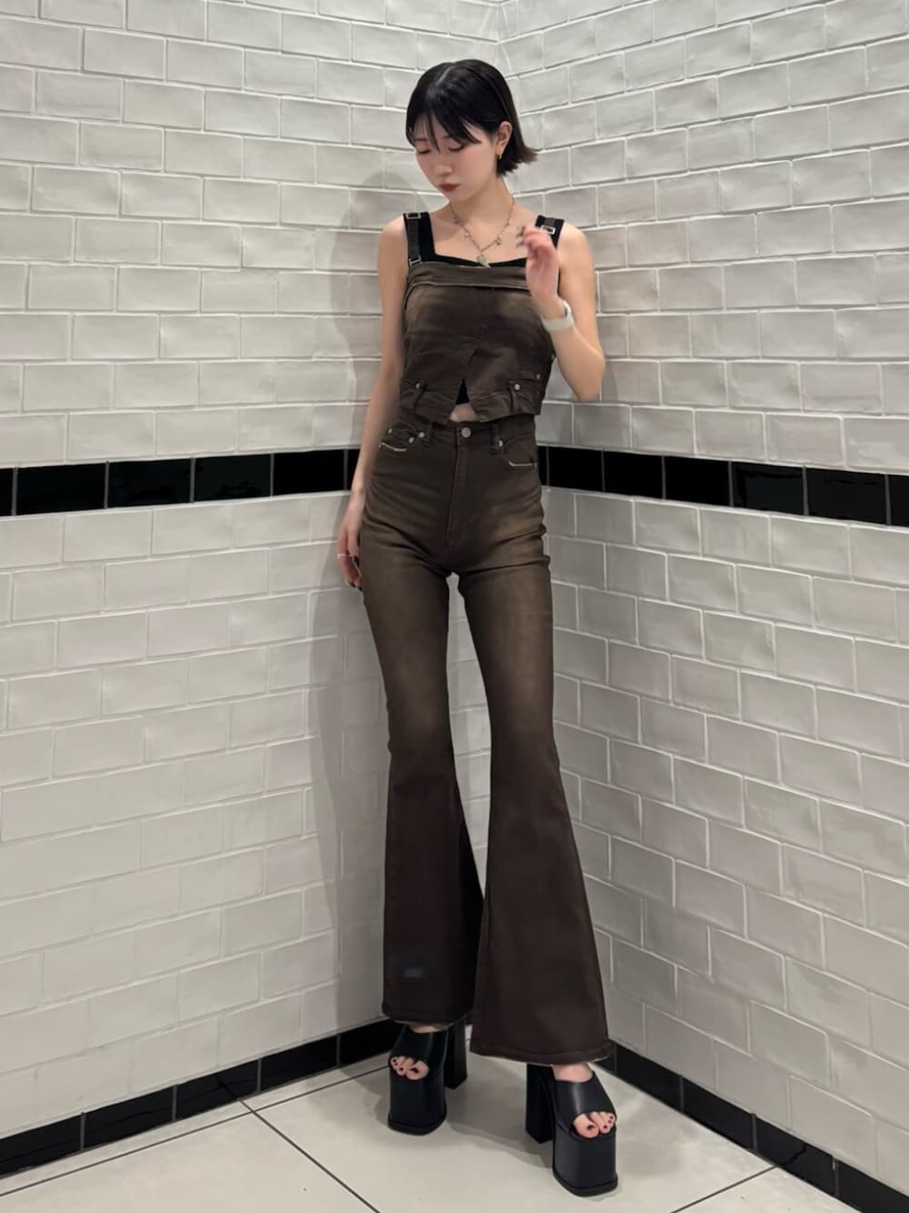 【サロペット】前にカットが入ってるから程よい抜け感🤍ストレッチ効いてるので着やすいです!下はハイウエストなので脚長効果🙆♀️ 【インナー】生地がモチモチで柔らかくて着心地とってもいいです!羽織の下に着ても可愛い🤍 【シューズ】23.5cmでMを着用しています!ヒールが高くて盛れる+高低差が少ないので歩きやすいです!