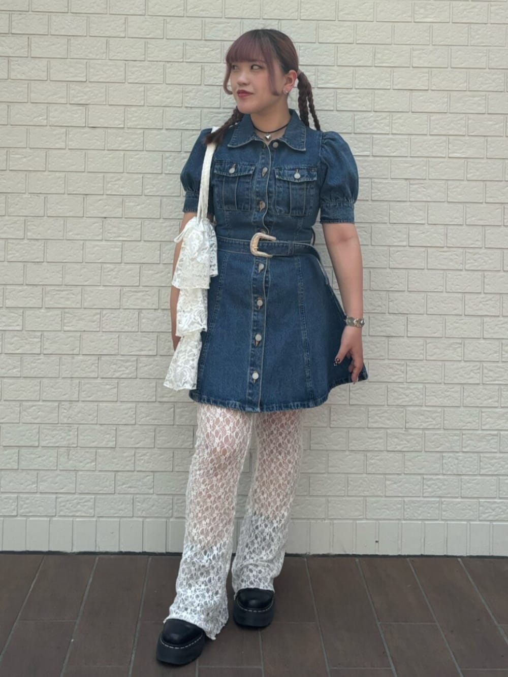 【ワンピース】jouetie定番のデニムワンピ✨️ ウエスト部分のバックルが高級感を出してくれてウエスト-3cm細見え👏 154cmで膝より少し上の丈感なのでミニを普段履かない方も挑戦しやすいです! フルオープンで羽織りでも使える2WAYアイテムです!!💕 【パンツ】今季流行りのレースパンツ!このアイテム着るだけでいつものコーディネートも華やかになります🫶 154cmで厚底5cm程必要です☺️ 【シューズ】シューレースを外して履くとカジュアルなコーデにも使えます♡ スニーカーソールになっているので長時間のお出かけにも疲れにくくピッタリです✨️ 【バッグ】 コーデのワンポイントになるレースバッグ! うちわやPCもすっぽり入る大容量!◎ 通学用や推し活バッグにもピッタリです👍✨️