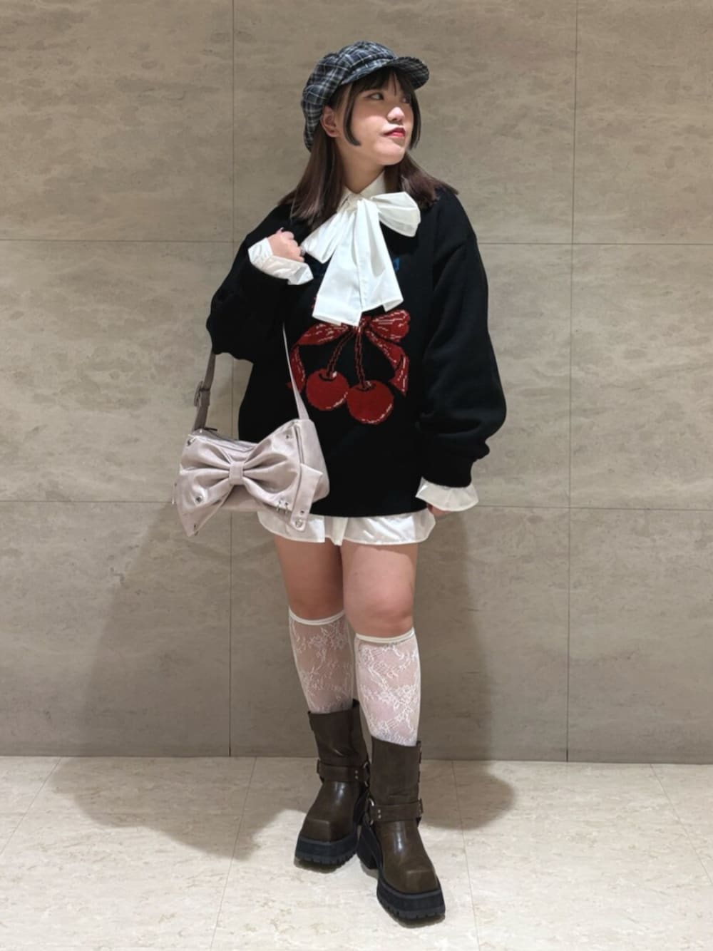 【ニット】 jouetie定番のジャガードニットからチェリー柄が登場!!🍒 着丈お尻まで隠れるのでインナーパンツを履くと1枚着でも着れちゃいます!👍 クリスマスコーデや、ライブ参戦用などでも大活躍間違いなし🎄👌 【シャツ】 大きなリボンが可愛すぎるシャツです😍 シャツは単品使いで1枚でも着れてお尻ぐらいまで隠れるぐらいの丈感です! リボンタイは取り外し可能なのでキレイめなコーデでもお使い頂けます!👍 【バッグ】 レザーに大きなリボンとハトメデザインが甘辛で可愛すぎる大容量バッグです! ペットボトルが横向きに入るくらいの大きさです! ショルダーベルトも調節可能なのでハンドバッグとしてはもちろん、いちばん長くすれば胸下ぐらいでショルダーとしても使えます! 【シューズ】 可愛すぎるショート丈のエンジニアブーツ! 足先がスクエアになっているので疲れにくく長時間でも履けちゃいます! ソールは厚底になっているので身長も盛れちゃうのが嬉しいポイントです!💖 普段23.5を履いていてMサイズがピッタリです! 【帽子】 チェック柄が可愛いキャスケットです💖 ゆったりめに作られてるのでヘアアレンジしてる時でも邪魔にならず使えます!👍