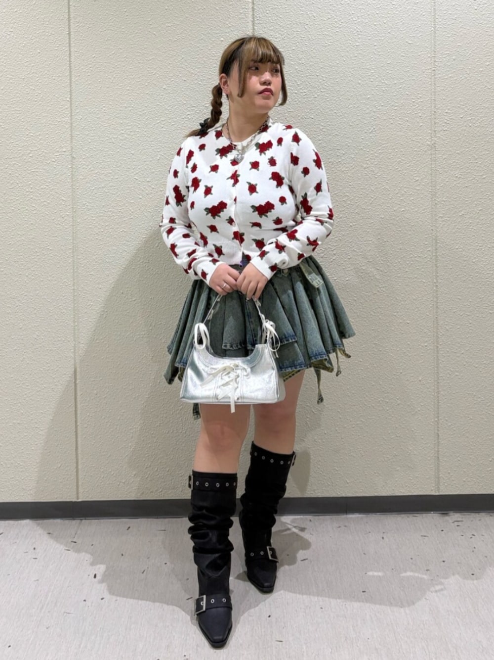 【トップス】 デザインが可愛いカーディガン🌹 羽織りはもちろんインナーとしてもこの春大活躍間違いなし👍 【スカート】 jouetie大人気アシメヘムスカートがデニムになって登場!👏🩵 シルエットも可愛く、脚が細見えします!♡ スカパンになっているのでインナーいらずの1枚で着れるのも嬉しいポイント😆👍 デニム素材なのでどんなコーデにも合わせやすいです👍 【ブーツ】 ベルトデザインが可愛すぎるブーツ😍 くしゃっとしても履けるのでトレンド感あって可愛いです!👍 23.5cmでMサイズでピッタリです✨️ 【バッグ】 レースデザインが可愛いハンドバッグです! jouetieらしい配色でコーデのワンポイントにもなります👍