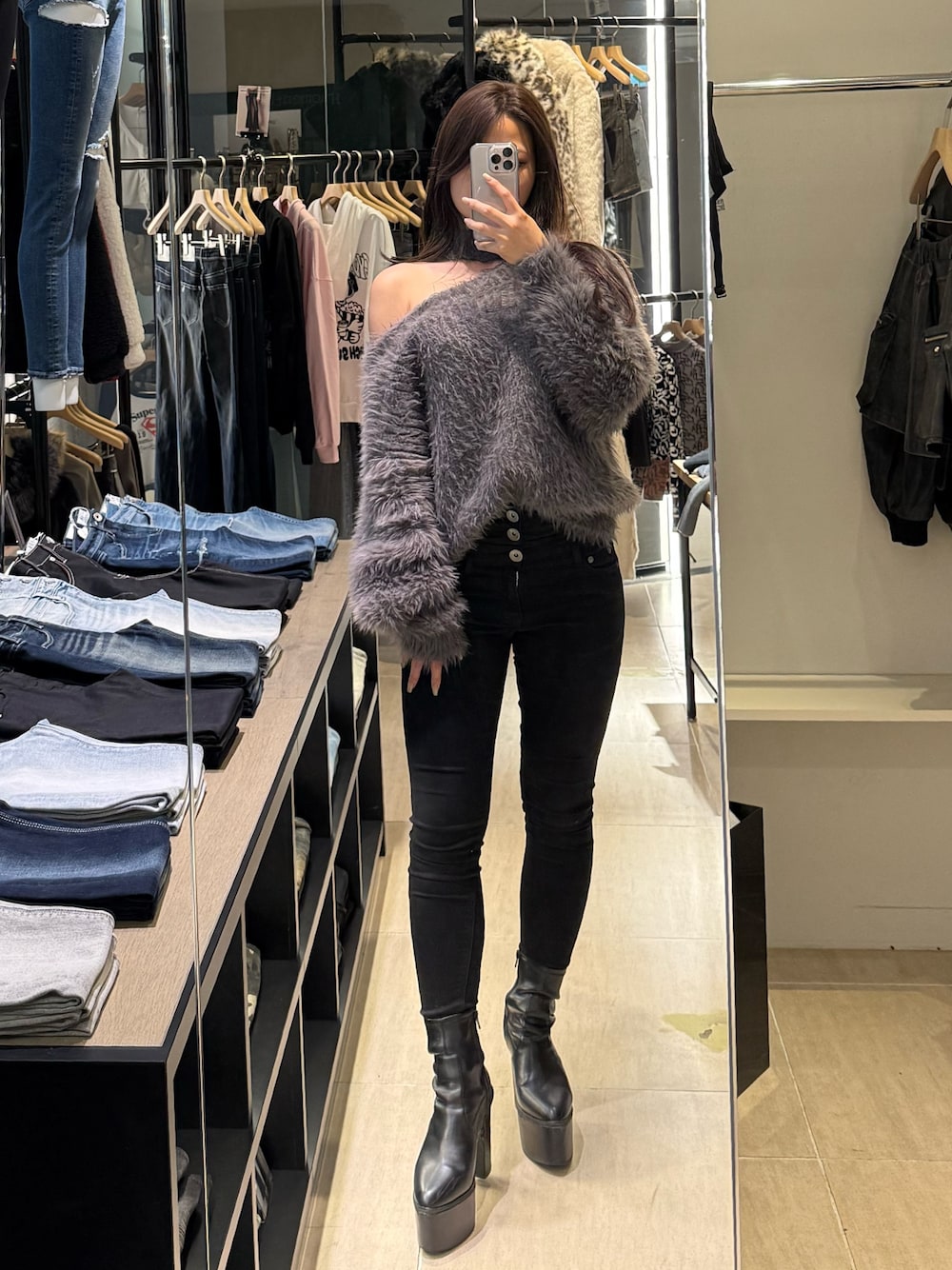 【tops】大人気のオフショルシャギーチョーカー2WAYニットトップス!! デコルテ部分が見えて大人セクシーです♡ ふわふわしているシャギーニットなのでレディーライクな甘さも表現できかわいいニットトップスです♡ 【pant】永遠に履き続けるパンツNo. 1!! どんなトップスでもカジュアルになりすぎない万能デニムです♡ 【shoes】】 安定で定番のショートブーツ♡ ヒールの高さは高いけど高低差が少ないので1日履いてても楽すぎてお気に入り🫶普段23.5cmの私はMサイズを着用しています!