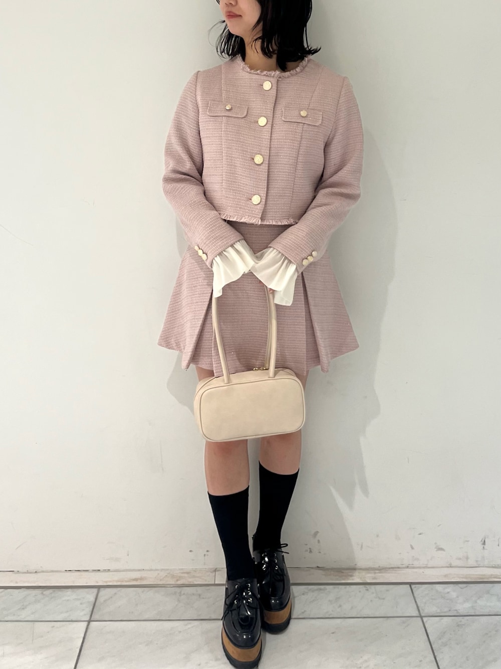 【トップス】キラキララメがお顔の印象明るく見せてくれます✨💗 生地感もさらっと着れるのでツイード特有のチクチク感も無くお使いいただけます🪡🤍 【スカート】ふんわりと広がっていて甘くなりすぎないデザインになっています🫶🏻🤍 インナーパンツ付きなので透け感気にせずお使いいただけます✨ 【シューズ】ヒールが8.5cmとしっかりと足元が盛れちゃうアイテムです👢✨ 【バック】持ち手も長く、色んなシーズンでお使いいただけちゃいます👜🤍