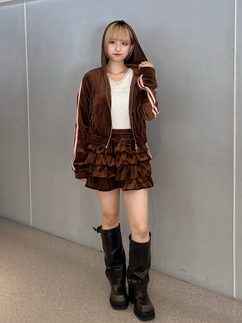 【フーディー】 トレンド感MAXなベロア素材! スポーティーなサイドラインが存在感抜群です🔆 【インナー】 ラインストーン付きのタンクトップ! カップ付きなので1枚で着られます!楽チン🎶 【スカート】 フーディーとセットアップに出来るフリルスカート! ティアードがボリューミーで脚が細見えします🐾 【ブーツ】 トレンドのカバーブーツ! ボリューミーなので脚が激盛れします✨️ 23.5cmでMサイズ着用です!