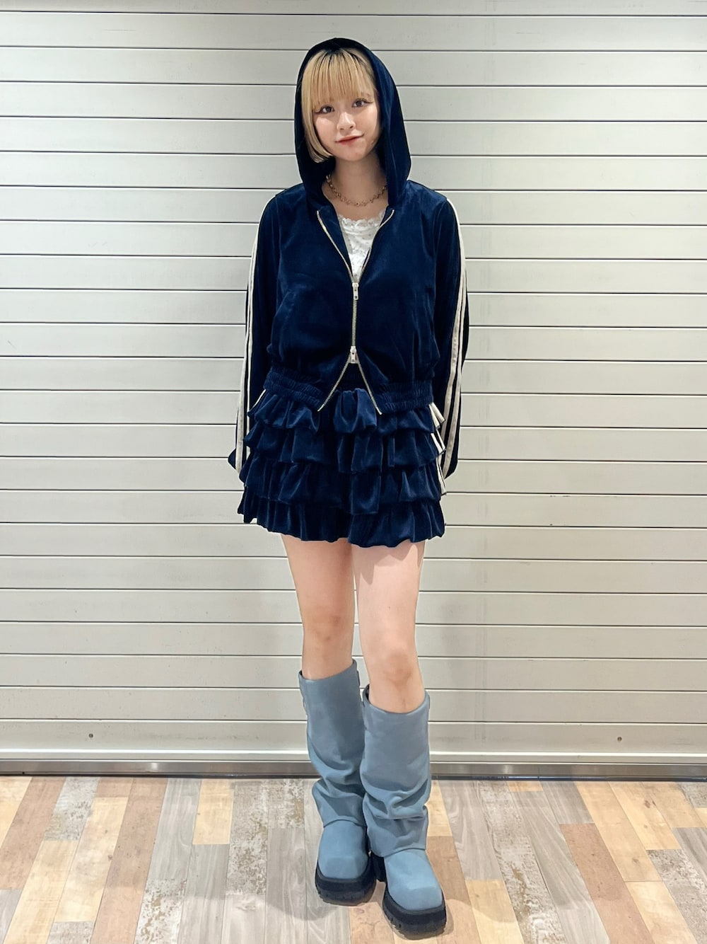 【フーディー】 トレンド感MAXなベロア素材! スポーティーなサイドラインが存在感抜群です💫 【インナー】 ラインストーン付きのタンクトップ! カップ付きなので1枚で着られます!! 【スカート】 フーディーとセットアップに出来るスカート! ティアードがボリューミーで脚が細見えします🐾 【ブーツ】 トレンドのカバーブーツ! ボリューミーでこちらも脚が激盛れです!! 23.5cmでMサイズ着用です!