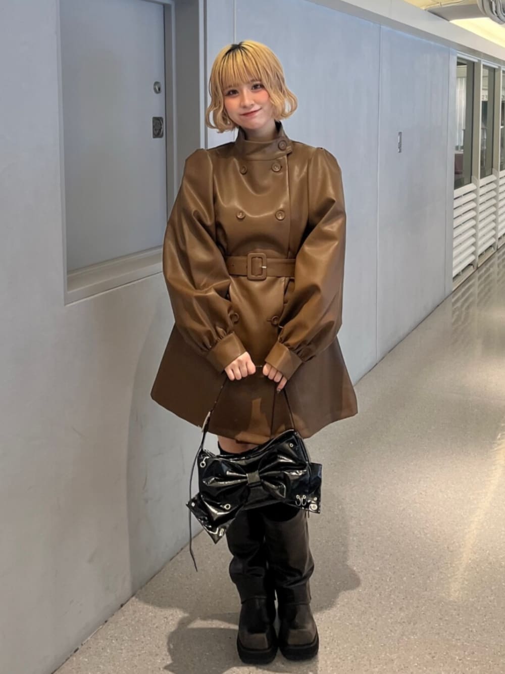 【アウター】 フレアシルエットとボリュームのあるスリーブがかわいいAラインコート! フェイクレザーなので1枚で甘辛コーデが叶います🪄︎︎ 付属のベルトでウエストマークすると甘く着られます💝 【ブーツ】 ボリューミーなカバーブーツ! 23.5cmでMサイズ着用です🐾 【バッグ】 大きなリボンのハンドバッグ🎀 500mlのペットボトルも入っちゃう大きさです!