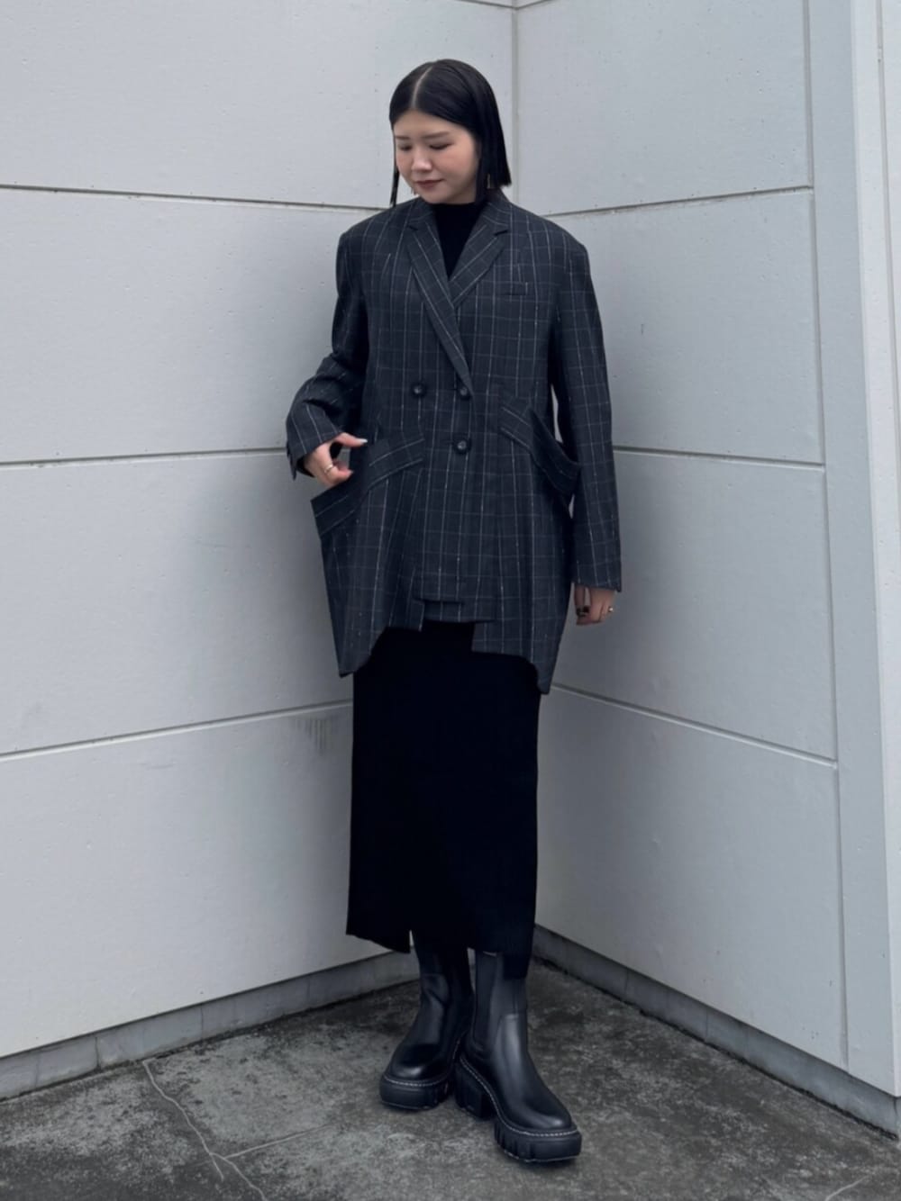 【ジャケット】 ラメを織り込んだストライプラインがポイントになったUN3D.オリジナルのラインチェック素材。 どこかレトロさも感じさせるモダンな印象の素材感を、UN3D.らしい構築的な立体感のあるデザインに落とし込んだジャケットです。 玉縁ポケットのディテールに挟み込まれたパーツが印象的なデザイン。少し長めの着丈なのでジャケットとしてはもちろんライトなコート感覚で着て頂けます。 【ワンピース】 様々なスタイリングに使いやすいシンプルなIラインシルエットのハイネックニットワンピース。 袖や腰上からの切り替えにリブ編みをMIXすることで、すっきりとメリハリのあるスタイルアップ出来るデザインになっています。 UN3D.定番の伸縮性に優れた扱いやすいニット素材で着心地も◎ どんなアウターとも相性が良く、1枚ではもちろんビスチェを重ねたレイヤードスタイリングなどにも使いやすい万能ワンピースです。 【シューズ】 サイドにUN3D.の文字が表現されており、底には”3”のくり抜きもさり気ないポイントに。 ソールを軽量に仕上げているので、驚くほど軽い履き心地です。 普段24cmで38サイズ着用しております。