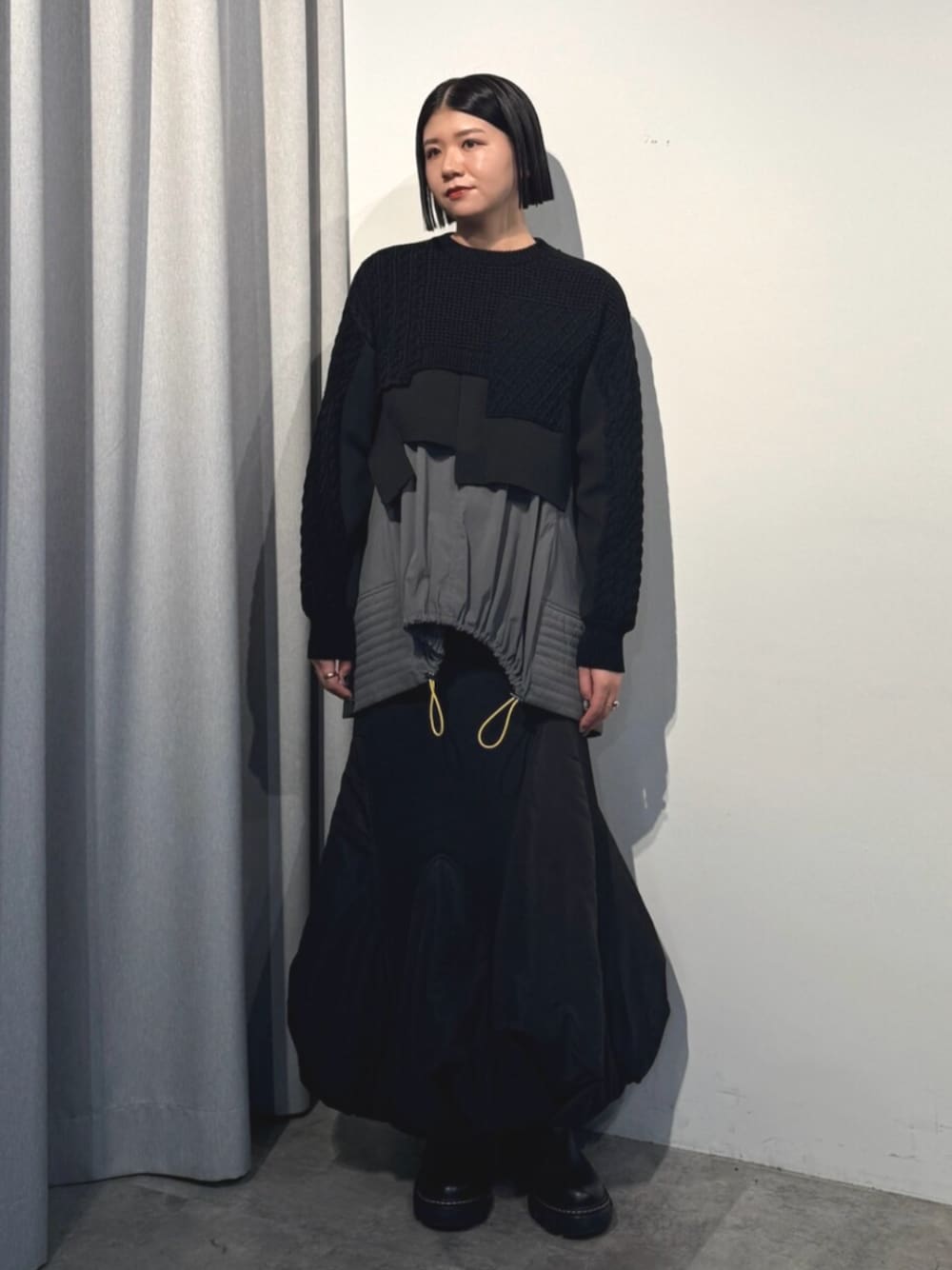 【トップス】 シャツを重ねたようなディテールを全てニットで表現したショートトップス。 モール糸で、いろんな種類のケーブル編みを組み合わせたような上部と、シャツのようなフラットな編地をドッキングしました。UN3D.らしいイレギュラーなヘムラインもポイント。下にシャツキャミを重ねて、シンプルになりがちな冬のレイヤースタイルを楽しめるニットです。 【キャミソール】 裾に中綿入りのキルトデザインを施したハリのあるテントシルエットが特徴のシャツキャミソール。フロントのラウンドギャザーデザインもポイントになっています。UN3D.定番の扱いやすいタイプライター素材を使用。ショートトップスのインナーに使いやすいキャミソール型です。 【スカート】 ランダムな裾パーツに中綿を入れてボリュームを出した特徴的なフォルムのスカートです。 サテンのような光沢感と柔らかい印象を兼ね備えたタフタ生地を使用。サイドにスラッシュポケット付き。ややハイウエストでフロントジップが付いているのでタックインして着ていただくのもおすすめ。裾はゴム仕様で伸びるので歩きやすいです。