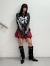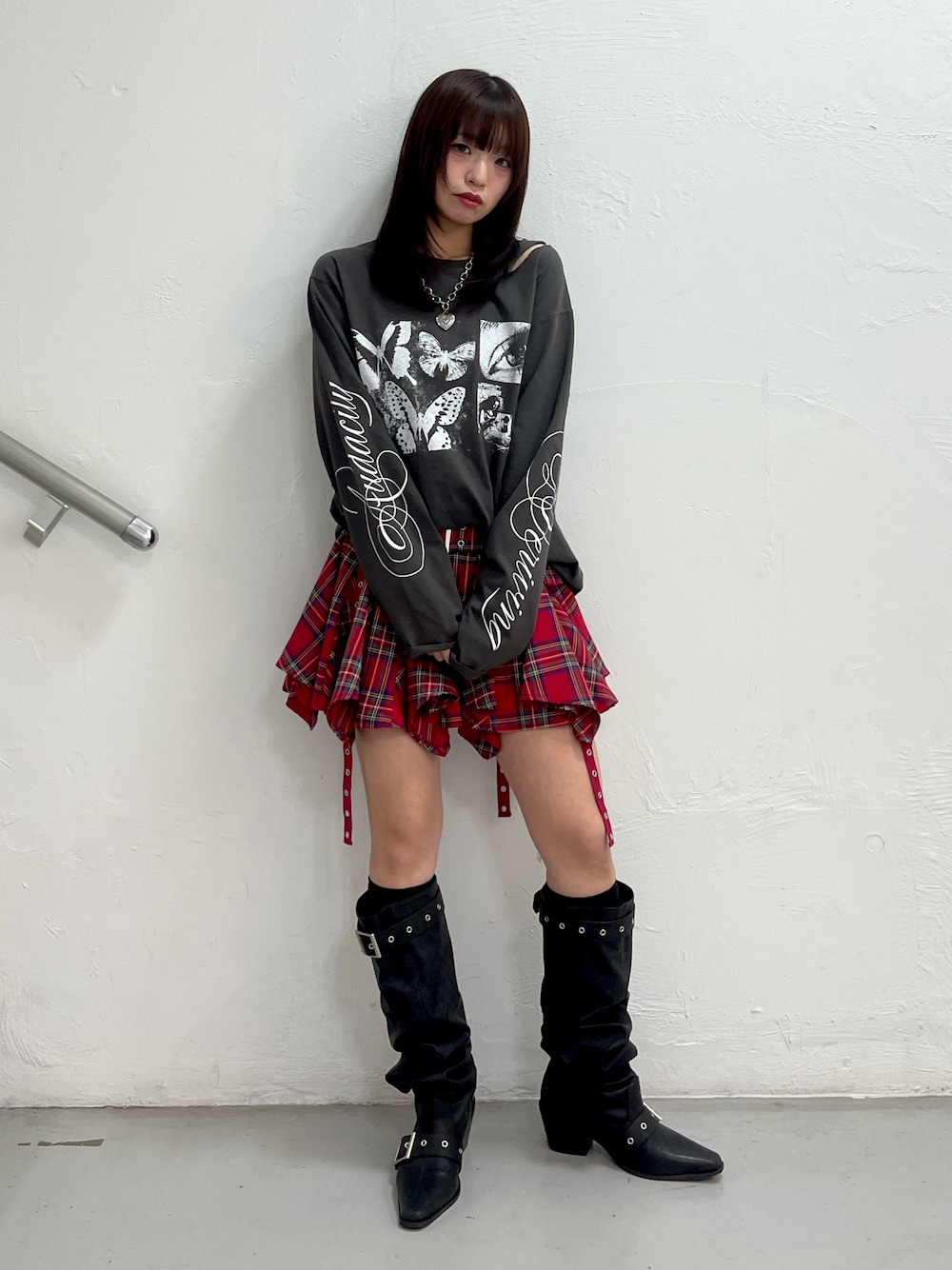 【トップス】 持ってて損なし!万能薄手ロンT🥹💞💞幅広い季節で着れる薄手のロンTは何枚持っててもいい🙂↕️ダメージ加工と袖までたっぷりのプリントが可愛い🌹なんてったってjouetieらしいデザインがかわいすぎる👼🏻 【ボトム】 大人気だったスカートが、生地感変わって新登場✨️✨️前回大人気だった赤チェック👍💕サラッとした生地になっていてオールシーズン使えます🙆♀️インパン付きで楽ちん🧚🏻♀️ 【ブーツ】 クシュクシュっとしたボリュームが激かわなブーツ✨✨ボリュームあるシューズは脚も盛れます> ̫ <ベルトのデザインでコーディネートを締めてくれます✌🏻私は24.5cmでLサイズ履いてます🍀*゜ 【ネックレス】 大きめのハートが存在感抜群なネックレス🫶🏻カジュアルなお洋服にもネックレス合わせたら締まりが🙂↕️✨チェーンも太めで可愛いです🎶