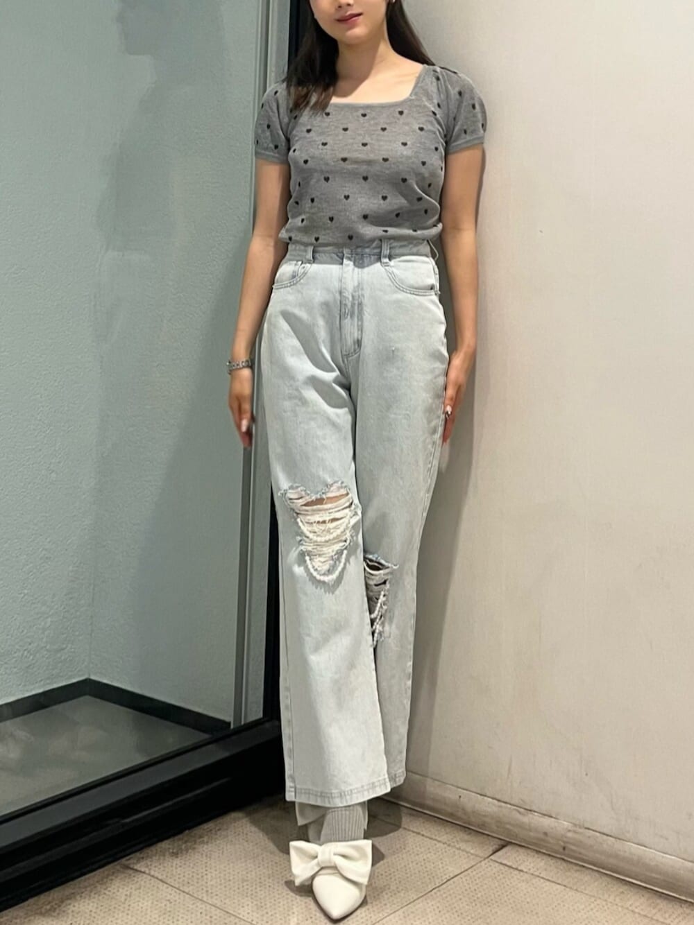 トップスはハート柄になっていてとっても可愛いです🥹💕 パンツはパールも取り外しができる2way型のパンツになってるので着回しがとっても効きます~😽🫶🏻 お靴は、普段23.5cmでMサイズを着用しています✨