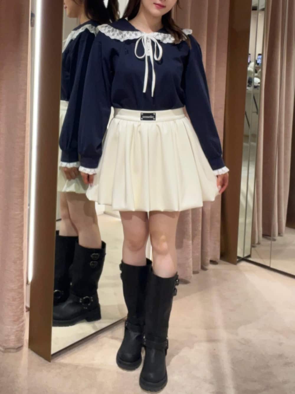 トップス→襟部分にレースがついていてガーリーで可愛いです!!♡ ボトムス→レザー素材のスカートでバルーン型はなかなかないのでめちゃくちゃおしゃれで可愛い着こなしできます♡ 靴→普段23.5cmでMサイズを着用してます!