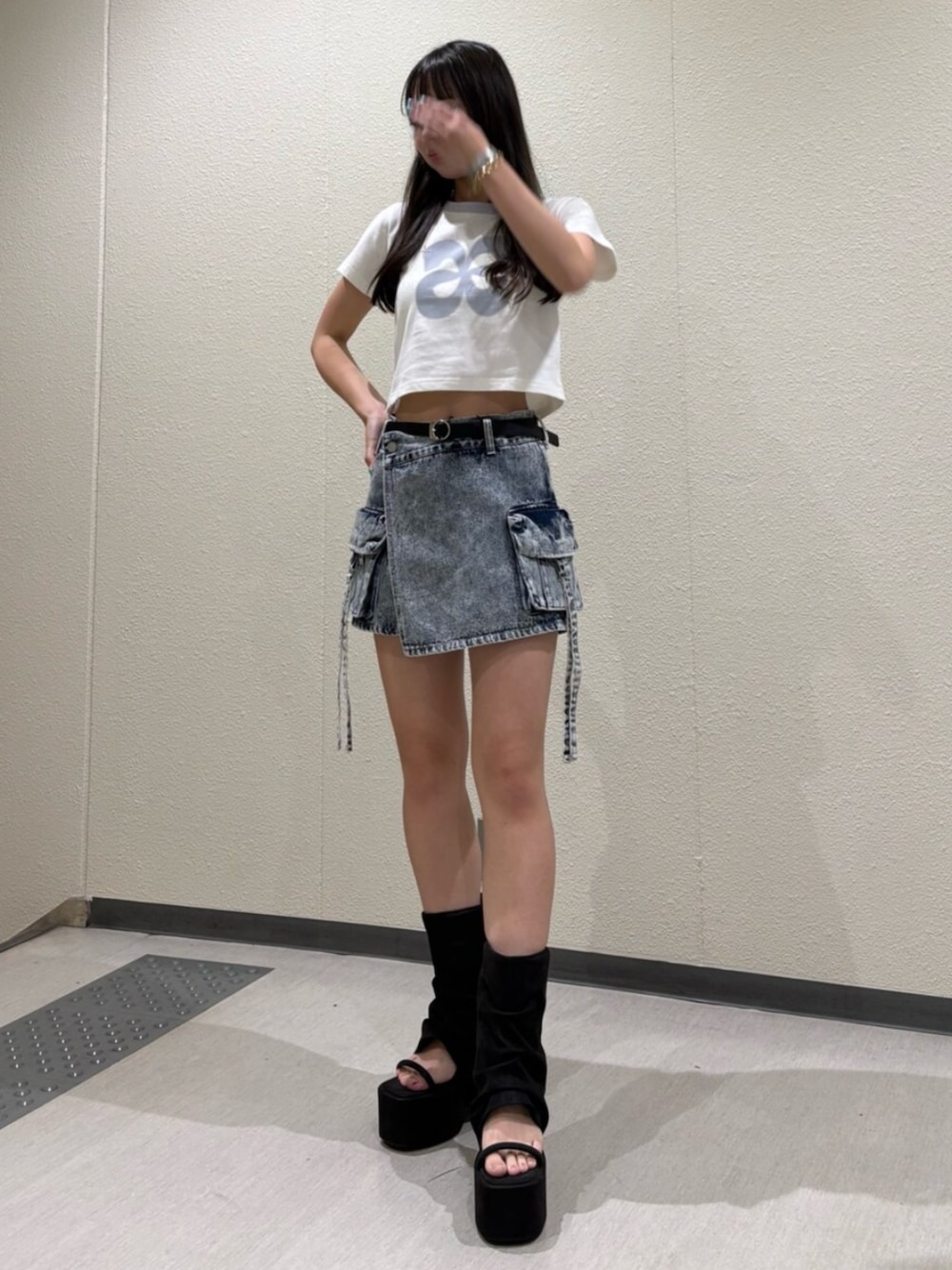 【トップス】 スタッズがアクセントのTシャツ👚 襟元がバイカラーになっているので、グレーの色味でも暗くなりすぎないデス😽💞💞 身幅も広めの作りになっているので、チビTが苦手な方にもオススメ‼️華奢見えします❤️🔥❤️🔥 【ベルト】 シンプルな黒のベルトです✨ ベルト穴も多めなので、普段ベルト穴が足りない方でも調節可能デス👀🫶🏻🫶🏻 【ボトムス】 160cmでSサイズを着用してます‼️ 前から見るとスカート風に見えますが、中はパンツになっているので、安心して履いていただけます💘 ウエスト周りにゆとりがあるデザインなので、腰履きもできますし、ハイウエストで履きたい場合は、ベルトで調節していただくと🙆🏻♀️デス 【シューズ】 今年の冬、流行っていたカバーブーツのサンダルver.です!ヒールが12cmもありますが、傾斜が少ないので疲れにくく、歩きやすいです! 23cmでMサイズでぴったりでした! ミニ丈のものだけでなく、ワイドパンツと合わせて裾からチラ見せも可愛いです💖