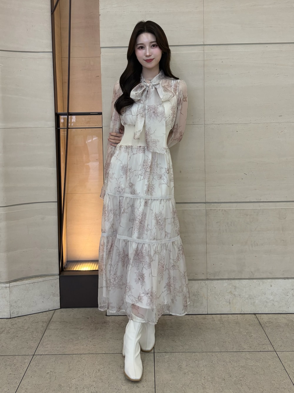 ・シアー素材×繊細な花柄で女性らしさたっぷり✨ ・ボウタイデザインが顔まわりを華やかに見せてくれます!! ・ウエスト切り替えでスタイルアップ効果◎ ・ホワイトブーツ合わせで抜け感&今っぽさプラス ・全体のトーンが統一されていて上品で清楚な印象❤︎ ブーツは、24.5センチで38でぴったりです!