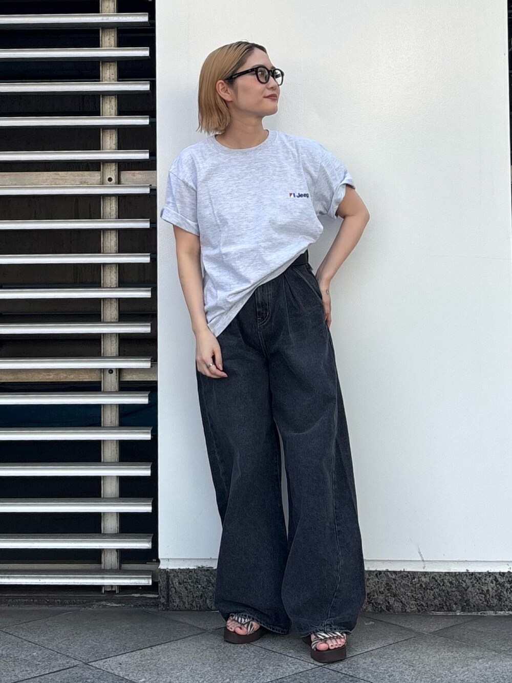 👕jeepとのコラボアイテム!! 古着好き、メンズライク好きにはたまらないデザインです! グリーンの文字がポイントなグレーを選びました!154㎝でおしり隠れるくらいの丈感です 👖再入荷! 154㎝で24インチ着用です ベルトでギュッと締めて履くのが可愛くて ハイウエストで合わせました! 厚底でギリギリ裾つかないくらいの丈感です