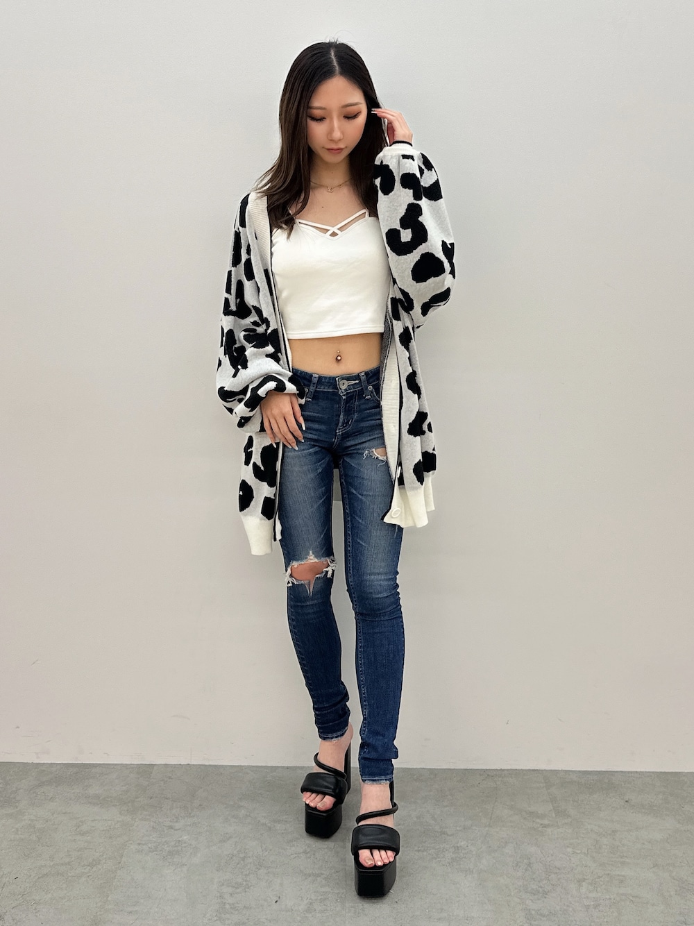 【カーディガン】 レオパード柄がポイントのカーディガン♡ 夏も羽織りやすい薄めの生地になり登場✨️ 梅雨などまだ肌寒い日などの羽織りに最適です!!♡♡レオパード柄の部分にはラメが入っているので動くとさりげなくキラキラするのもポイントです! 【ビスチェ】 大人気のビスチェ♡ カップ付きで1枚で着用可能です! デコルテ部分のデザインが可愛いのでインナーに入れてチラ見せするのも可愛いですし1枚でトップスとして着用もできます! 【デニム】 GYDAの定番デニム♡⃛ サイドのダメージがポイント✨️ (156cmでXSサイズ着用)でウエスト部分はジャストウエストなので骨盤ピッタリでおへそがしっかりでます!くるぶしが隠れる長さで短すぎず履いていただけます!! 【シューズ】 サッと履きやすいチャンキーサンダル♡ クッション性もありふわふわの生地感なので疲れにくく柔らかいので足の甲のデザイン部分はもちろん歩いてても痛くなりずらいです!! デニムやロングワンピなどとの合わせがオススメ✨️ 23.5cmでMサイズ着用!!