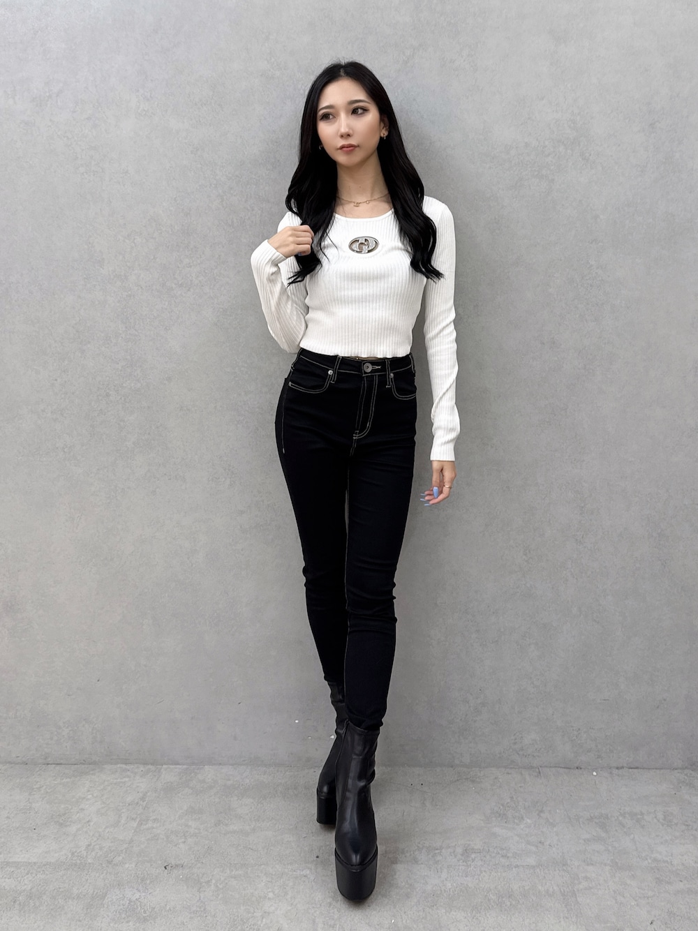 【トップス】 大人気のトップスの長袖Ver 胸元のストーンのロゴがワンポイントで可愛いアイテムです 分厚すぎない生地なので涼しくなってきた時期からアウターを羽織れば 冬本番も大活躍すること間違いなしです♡ 【デニム】 大人気のワンウォッシュスキニーパンツ! ストレッチがとっても効いていて履きやすいプラスハイウエストでとっても美脚効果抜群の最強アイテムです! 156cmでXXSサイズ着用 丈はくるぶし下でピッタリ履けて長すぎず短すぎず丁度良く着用できています♡ ̖́- 【シューズ】 23.5cmでMsize着用です! ヒール高めですが高低差少なく安定感もあるので足も疲れにくく歩きやすいです!!