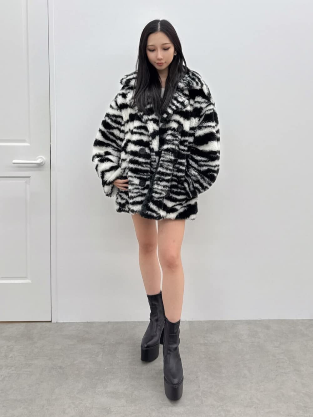 「アウター」 ゼブラ柄で1着目でコーデのアクセントになるボアのロングコート♡♡ モコモコで暖かくゆったりしてるので中にもかなり着込めます💕 中にはビンテージスカートにビジューがついている新作のスカートをINしています❤︎ ちらっと見えた時にビジューが光って可愛いです! 【シューズ】 23.5cmでMsize着用です! ヒール高めですが高低差少なく安定感もあるので足も疲れにくく歩きやすいです!!