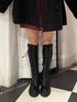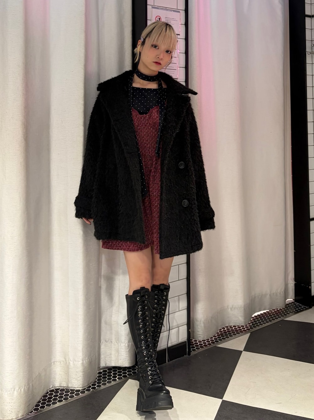 【アウター】 ふわふわとした素材感が魅力のアウターです! 軽い着心地で、冬のコーディネートの主役になるアイテム! 大きめの襟デザインが顔まわりをすっきり見せてくれて小顔効果も! デニムと合わせてカジュアルにも着こなせます! 【ワンピース】 キラキラ可愛いツイードキャミワンピース! オケージョンシーンにはもちろん、デニムと合わせてカジュアルダウンもできるので、幅広いコーデを楽しめます! 【トップス】 流行りのドットデザイン! インナーとしても大活躍で、ギャザーデザインなので一枚で着ても可愛いです! 【ブーツ】 24.5cmでLサイズ着用 レースアップのデザインが珍しくて可愛い! 履くだけでスタイル良く見せてくれる優秀アイテムです! 見た目以上に軽量で、長時間の着用でも疲れにくいです!