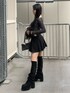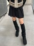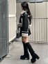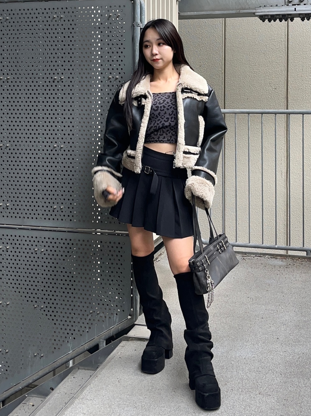 冬のブルゾンギャルコーデ 💟OUTER💟 ファーが可愛いムートンブルゾン🤍🖤 襟やポケット、内側までびっしりファーがついてることで、暖かさと高級感のある見た目を楽しめます🎶🥹 思ってる以上に軽いので、冬のお出かけも楽しく過ごせます😻🖤 丈も短いのでスタイルアップ出来ます!!✊🏻💞 💟TOPS💟 店頭で大人気の長袖トップス!👩🏼💖 少し透け感のあるシアー感と、ベロア素材の唯一無二のトップスです🥹🖤 1枚着るだけで雰囲気完成しちゃう、ギャルコーデにも使えるアイテムです🥵💞 秋は1枚でサラッと、冬はアウターや羽織りのインナーとして使えます🥹🩷 レオパード柄は一枚で着ても圧倒的存在感🥺🖤ピタッとしたシルエットで魅せれるアイテム🥹💗 💟BOTTOMS💟 プリーツの上にスタッズベルトが付いたスカート🖤履くだけで今どきコーデ完成します🥹🩷 シルエットがしっかりA型なので足の細見え半端ないです🥹 (Sサイズ着用・少しゆとりあり :ウエスト 62cm・腰骨79cm・ヒップ83cm) 💟BOOTS💟 ネットでも話題沸騰🥹🩷 超足盛れる&細見えする厚底ブーツです!! S.M.Lでどれも厚底あるので、スタイル抜群なコーデができます🖤🪩 ヒールですが、底が面になってるので安定性・歩きやすさは抜群です🥹🎶 スエードっぽいマットな生地は伸縮性があるので、とっても履きやすく適度な着圧感あります💖 ギャザーデザインで存在感出しつつも、どのスカートも合わせられるオールラウンダー😻 (普段23.5-24.0cmでLサイズ着用です!) 💟BAG💟 ビンテージな風合いのレザーミニバッグです🖤スリムなスクエアでトレンド感もありつつ、意外と容量のある実カタイプ!! チャーム付きなのでコーデのポイントとしても使えます🥹 💟コーデのポイント💟 モノトーンをい指揮しながら、インナーに隠れ主役のレオパード柄を入れることで、着ても脱いでもかわいいコーデにしました!🥺💖 適度な肌見せを挟むことで、アウター着ても重くない印象にしてます💞