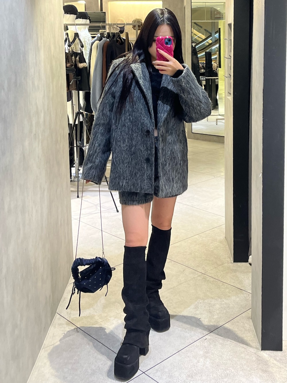 💟OUTER💟 シャギーの冬らしい華やかな素材感が可愛いジャケットです🖤🖤🖤 オーバーサイズなのでミニ丈にゆったり合わせると、ミニワンピみたいなシルエットになるので美脚細見えするコートです🥺💗 ジャケットではありますが、カジュアルな素材感なので、キッチリした場所以外にもテーマパークやライブなどにも使えるオシャレなアウターです🥹🫶🏻 💟TOPS💟 シャギーの素材感とカットのデザインがほんっとに可愛いスキンニットです💖 このカットデザインが可愛すぎて、このシャギーバージョンもリアルバイしています!🥹🖤 丈長めの袖かつ、手本にスリットが入っているので手先まで華やかに見えて素敵です🤍 またカットのデザインはインナーの紐が見えない位置に入っているので、下に何着るか迷わなくていいのも嬉しいポイントです😭💗 (タンクトップなど太めのインナー紐は見えてしまうので細紐推奨です✨️) 素材のふさふさ感のお陰で存在感あるので、アウターのインナーに使ってチラ見せや、スウェトパンツに合わせてメリハリコーデにするのも可愛いです🥹🖤 💟BOTTOMS💟 シャギーのジャケットとセットアップ可能なシャギーのショートパンツです💗💗💗 シャギーの優しい印象や冬らしい雰囲気があるので、コーデに入れるだけで一気に季節感あるコーデができます🥹🩷クリスマスやバレンタインなどにもオススメ😻♥️♥️♥️ シルエットはぴたっとせず裾が広がるような台形タイプなので、ミニ丈でも細見えするパンツです🫶🏻 (Sサイズ着用・少しゆとりあり :ウエスト 56cm・腰骨79cm・ヒップ83cm) 💟BOOTS💟 ネットでも話題沸騰🥹🩷 超足盛れる&細見えする厚底ブーツです!! S.M.Lでどれも厚底あるので、スタイル抜群なコーデができます🖤🪩 ヒールですが、底が面になってるので安定性・歩きやすさは抜群です🥹🎶 スエードっぽいマットな生地は伸縮性があるので、とっても履きやすく適度な着圧感あります💖 ギャザーデザインで存在感出しつつも、どのスカートも合わせられるオールラウンダー😻 (普段23.5-24.0cmでMサイズ着用です!履く時は慣れるまでキツかったですが、沢山履いたら馴染んできました🥹!) 💟ACCESSORY💟 ラメとベロアの華やか差がホリデーシーズンやバレンタインなど冬のイベントにピッタリなシュシュです😻♥️♥️♥️ 垂れるリボンやシルバーハートのパーツが可愛いです🖤 しっかり中のゴムが程よい強さだったので、結びやすいです!ただ綺麗に結べた方がいいので、先にゴムで結んでおいてシュシュつける方がいいかなと思います🥹💗 💟BAG💟 EMODAのホリデーコレクションのスタッズバッグです🥹💘🌌 今期を象徴するトレンドのベロアとスタッズとギャザーをホリデー仕様にミックスされた、最高に可愛いミニバッグです🥹💞💞 垂れるリボンもほんっっと可愛いです😻💘 そのままハンドバッグとしても、シルバーチェーンをつけて方にかけて使うことも出来ます🙌🏻🤎 💟コーデのポイント💟 モノトーンでしめつつもアイテムの素材感で華やかな印象になるようにしました🩷