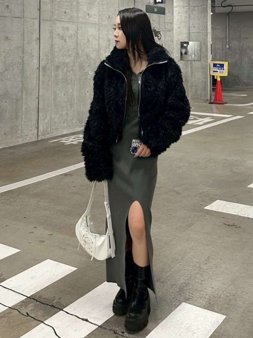 💟OUTER💟 もこもこのシルエット柄可愛いボアブルゾン💖毛の密度も濃く、厚みがあるのに中に着込んでも着膨れしない最強アウターです😻💞 丈が短めだからボテっとした印象にもならず、着るだけでスタイル良く見えます🩷ハイウエストのボトムスを合わせるのがおすすめ! 首までジップをあげると、マフラー使わなくてもいいくらい首をホールドしてくれます🥹💞 ジップは噛みにくいようにチャック周りに毛がないようになっているのも嬉しいポイントです😻🙌🏻 💟ONEPIECE💟 フロントのカールデザインやスリット、体のラインを出してくれる美シルエットが素敵なワンピースです🥹🖤 体のラインを全てを拾いすぎず、でもクビレなどはきゅっと細見えしてくれる細見えワンピでもあります💖 どのカラーも深みのある色で大人っぽい印象になります♥️ 155cmの私は厚底履かなくても地面には付かないですが、8cm位は厚底あると安心して着れるし見映えもいいなと思いました💗💗 💟BOOTS💟 EMODAの王道人気タンクブーツです🖤 ショート丈なので デニムやパンツはもちろん、ミニスカにも合わせられて色んなコーデに使えます🥹♥️♥️ ソールがゴムで安定感もバッチリなので、厚底履きなれない方でも履きやすいブーツです😻🩷 (普段23.5-24.0cmでMサイズ着用 💟BAG💟 レースアップのデザインと鮮やかな発色が目を引くレザーバッグです👑 見た目は小さいですが、マチが広く容量もテーマパークなどに行くには十分な大きさです!!😻💗 色んなコーデに合わせやすいので、プレゼントにもオススメです🥹🫶🏻 💟コーデのポイント💟 クールなダークトーンで全体を統一しつつ、バッグにパキッとした白を持ってくることで暗すぎない印象にしました🪽⛓ アウターが丈短めなので、ワンピースの1番の見せどころであるキュッとなるクビレを出してくれています🖤🐈⬛