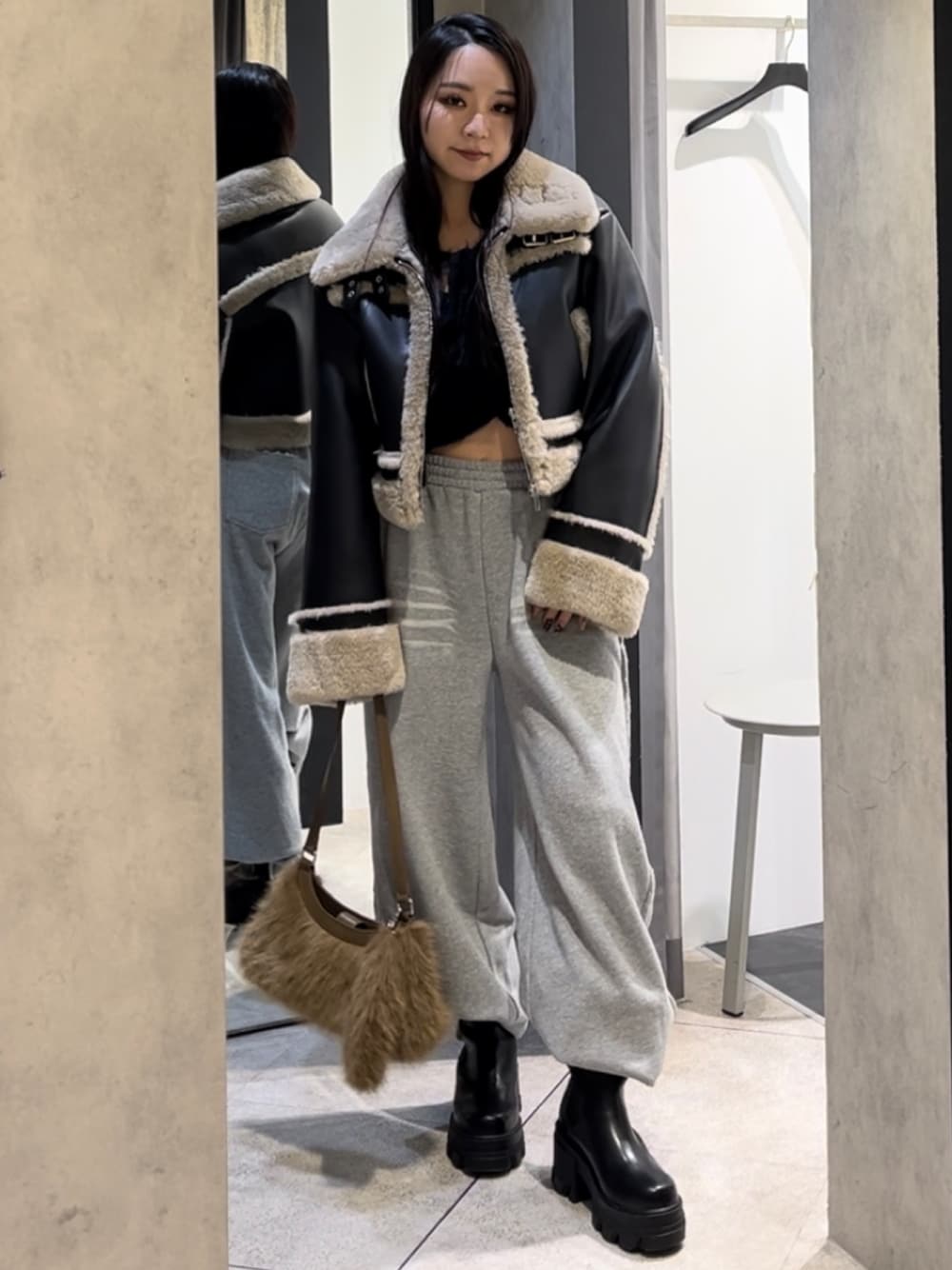 💟OUTER💟 ファーが可愛いムートンブルゾン🤍🖤 襟やポケット、内側までびっしりファーがついてることで、暖かさと高級感のある見た目を楽しめます🎶🥹 思ってる以上に軽いので、冬のお出かけも楽しく過ごせます😻🖤 丈も短いのでスタイルアップ出来ます!!✊🏻💞 💟TOPS💟 シャギーのふわふわとドレープのゆったりしたデザインの掛け合いが可愛すぎるニットです🥹♥️クロスデザインは前でも後ろでも使えるので、2WAY仕様です💖💖💖 手元もゆったり可愛いので、フェミニンな印象にできますし、丈が短いのでハイウエスト無ボトムスに合わせるのがスタイル抜群になるのでオススメです💖 💟BOTTOMS💟 トレンドのスウェット!しっかりワイドなシルエットなので海外ギャルみたいなコーデと相性抜群💖🎶 側面にダメージデザインが付いていたりハイウエストなのがEMODAらしい! デザイン性のあるベルトを巻くと、よりオシャレなスタイリングになります🥵💖 身長155cm・ウエスト 56cm・腰骨79cm・ヒップ83cm Sサイズ着用! 腰回りとかはゴムなのでフィットしますし、丈もちょうど良かったです!!🤍 💟BOOTS💟 EMODAの王道人気タンクブーツです🖤 ショート丈なので デニムやパンツはもちろん、ミニスカにも合わせられて色んなコーデに使えます🥹♥️♥️ ソールがゴムで安定感もバッチリなので、厚底履きなれない方でも履きやすいブーツです😻🩷 (普段23.5-24.0cmでMサイズ着用 💟BAG💟 ふさふさのファーに覆われたバッグです🥹🤍見た目のインパクトがあるので、コーデのワンポイントにも使えるし、トレンド感を一気に出すことが出来ます😻💖 💟コーデのポイント💟 しっかりお洒落なムートンアウターにスウェットを合わせることでミックス感とこなれ感を出してます🖤