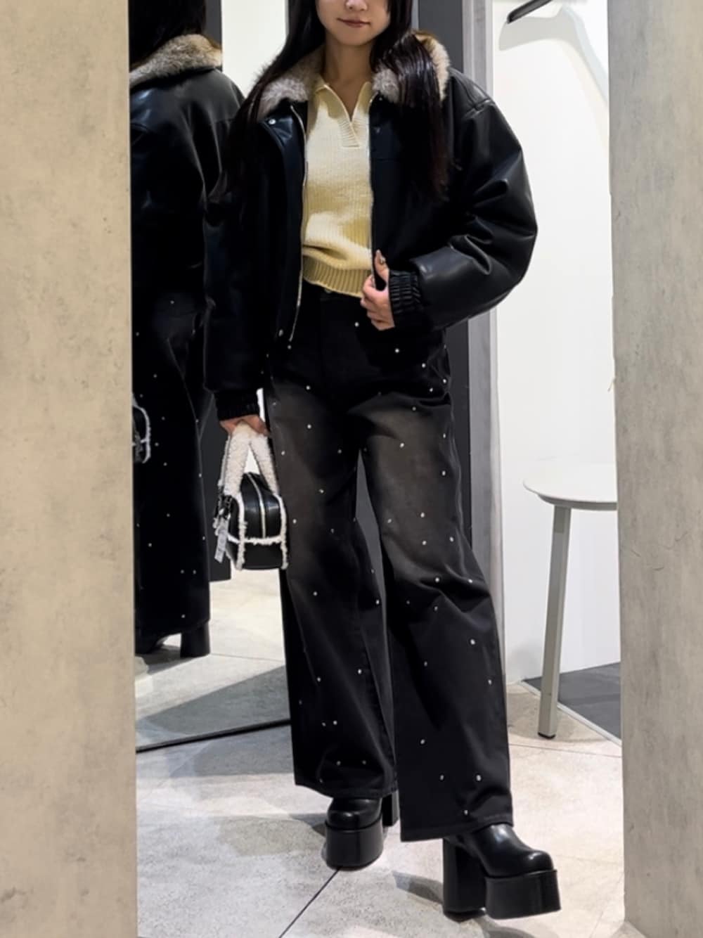 💟OUTER💟 目を引くギャル可愛いファーの襟と、もちっとした綿入りのフェイクレザーが可愛いアウターです🥹🖤 3色もあってブラックとブラウンは合皮、ベージュはスエード素材です🥹💗 丈が2種類あり、ハイウエストなデニムに合わせてかっこよくきるSサイズとダボッとミニ丈合わせて着れるMサイズを選べます🥺🫶🏻 襟のファーは取り外し可能なので、シーによっては襟なしのシンプルなデザインを楽しめます🙌🏻🤎 着用はブラックのSサイズ🖤 💟TOPS💟 入荷してすぐ完売しそうになったスキッパーニット!各カラーの可愛さはもちろん、ゆったりしたシルエットや襟のデザインが可愛いニットです💖 💟BOTTOMS💟 キラッと光るビジュー、ウォッシュの色合いやウエストのクロスベルトデザインがトレンディなワイドデニムです🥹🖤🖤💍 ビジューがキラッとするのでクリスマスは間違いないですし、シルエット自体もしっかりワイド感楽しめるのがイチオシポイント!😭💖💖 ハイウエストでくびれ部分はクロスデザインになっていることから、内側に内側に目線を持ってこれるので、細見えも半端ないです🥹💗 (Sサイズ着用・少しゆとりあり :ウエスト 56cm・腰骨79cm・ヒップ83cm) 💟BOOTS💟 超足盛れる厚底ブーツです!! S.M.Lでどれも約12cmあるので、スタイル抜群なコーデができます🥹🩷 ヒールですが、底が面になってるので安定性・歩きやすさは抜群です❤️🔥 シンプルなデザインなので、どのコーデにも使えて、デニムパンツもスカートも合わせられるオールラウンダー💖 (普段23.5-24.0cmでMサイズ着用です!) 💟BAG💟 モコモコのボアが可愛いバッグ!! 容量もあるのでテーマパークにオススメです! しっかり存在感があるので、コーデのワンポイントとして使えます💗🪩