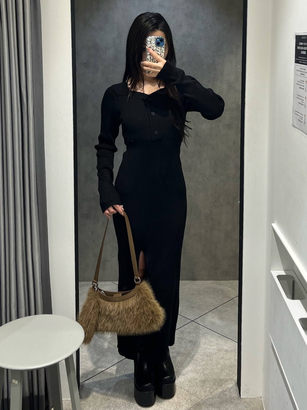 💟ONEPIECE💟 フロントのカールデザインやスリット、体のラインを出してくれる美シルエットが素敵なワンピースです🥹🖤 体のラインを全てを拾いすぎず、でもクビレなどはきゅっと細見えしてくれる細見えワンピでもあります💖 どのカラーも深みのある色で大人っぽい印象になります♥️ 155cmの私は厚底履かなくても地面には付かないですが、8cm位は厚底あると安心して着れるし見映えもいいなと思いました💗💗 💟BAG💟 ふさふさのファーに覆われたバッグです🥹🤍見た目のインパクトがあるので、コーデのワンポイントにも使えるし、トレンド感を一気に出すことが出来ます😻💖 💟BOOTS💟 超足盛れる厚底ブーツです!!💞 S.M.Lでどれも12cm前後のヒールがあるので、スタイル抜群なコーデができます🖤 ヒールですが、底が面になってるので安定性・歩きやすさは抜群です❤️🔥🎶 シンプルなデザインなので、どのコーデにも使えて、デニムパンツもスカートも合わせられるオールラウンダー💖 (普段23.5-24.0cmでMサイズ着用です!) 💟コーデのポイント💟 黒ワンピを引き立てくれるファーのバッグでメリハリと海外レディー感を出してかっこよくしました🥂𓈒𓏸︎︎︎︎