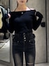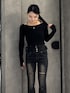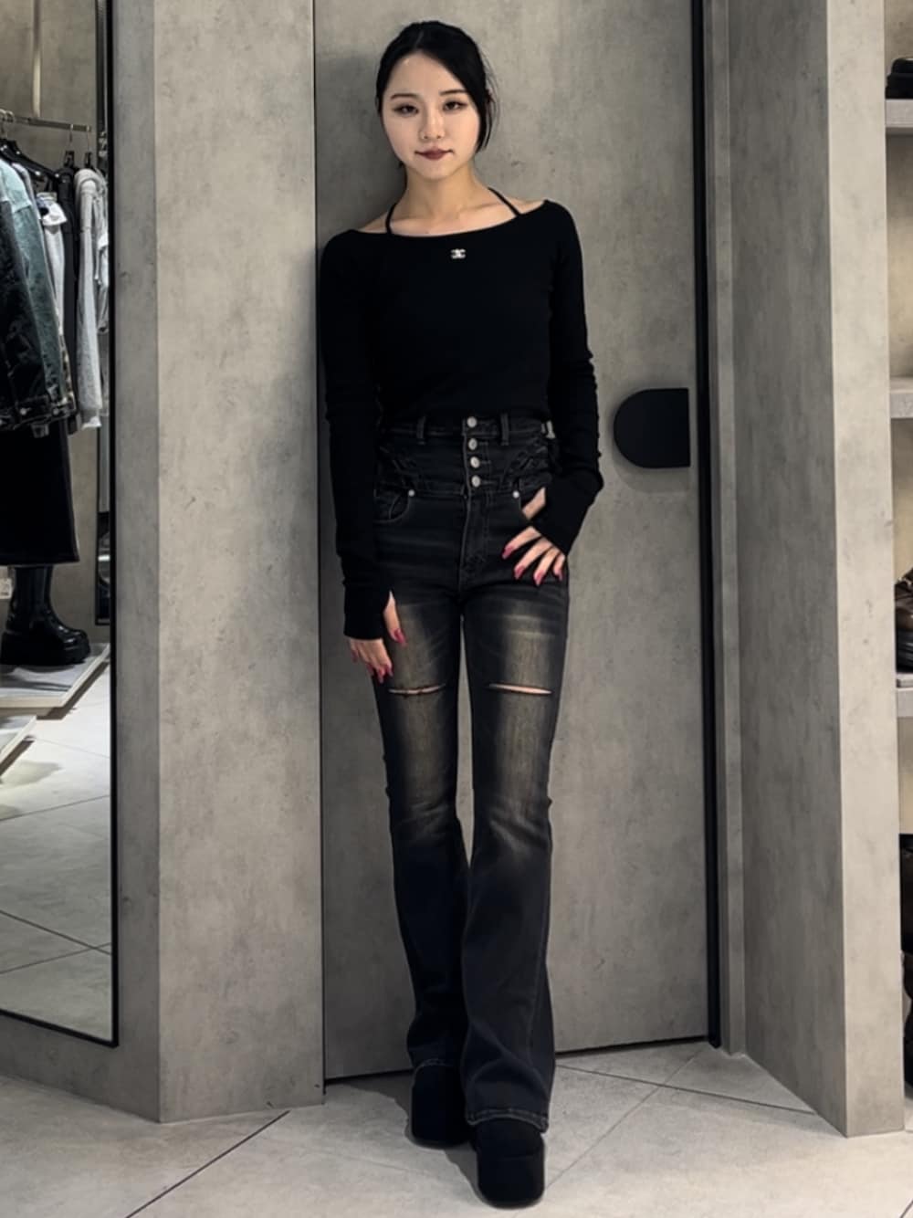 💟TOPS💟 首周りの2WAYチョーカーが可愛いトップスです!お色味もはっきりしたモノトーンや絶妙カラーのイエローなどカラバリ豊富! 若干延びる着心地のいいコットン生地なので、通気性もよく夏前にもピッタリです🪽 首周りのチョーカーは、前にクロスしても後ろにクロスしても可愛いようになってます💖🫶🏻 肩も少し下げてオフショルに出来ます🥺🩷 💟BOTTOMS💟 マイナス5キロデニムのフレアパンツ🥹🖤 ハイウエスト+長めの丈なので、足が8割のスタイルになるのがポイント💗 カーブの編み上げレースデザインが可愛いフレアパンツです🖤膝上の太ももにダメージが入っているので、カジュアルな可愛さがあるのもポイント🥹💖 どのカラーも唯一無二なカラーで、春夏に向けて可愛い色展開です🎶 (XSサイズ着用・少しゆとりあり :ウエスト 56cm・腰骨79cm・ヒップ83cm) 💟BOOTS💟 人気の厚底ブーツの中でもスエード生地で高級感あるギャル厚底🥹🖤他のブーツに比べて足首のところが足に沿うように薄い生地になっているので、足を綺麗に見せてくれます🥹💖 (普段23.5-24.0cmでMサイズ着用 ぴったり)