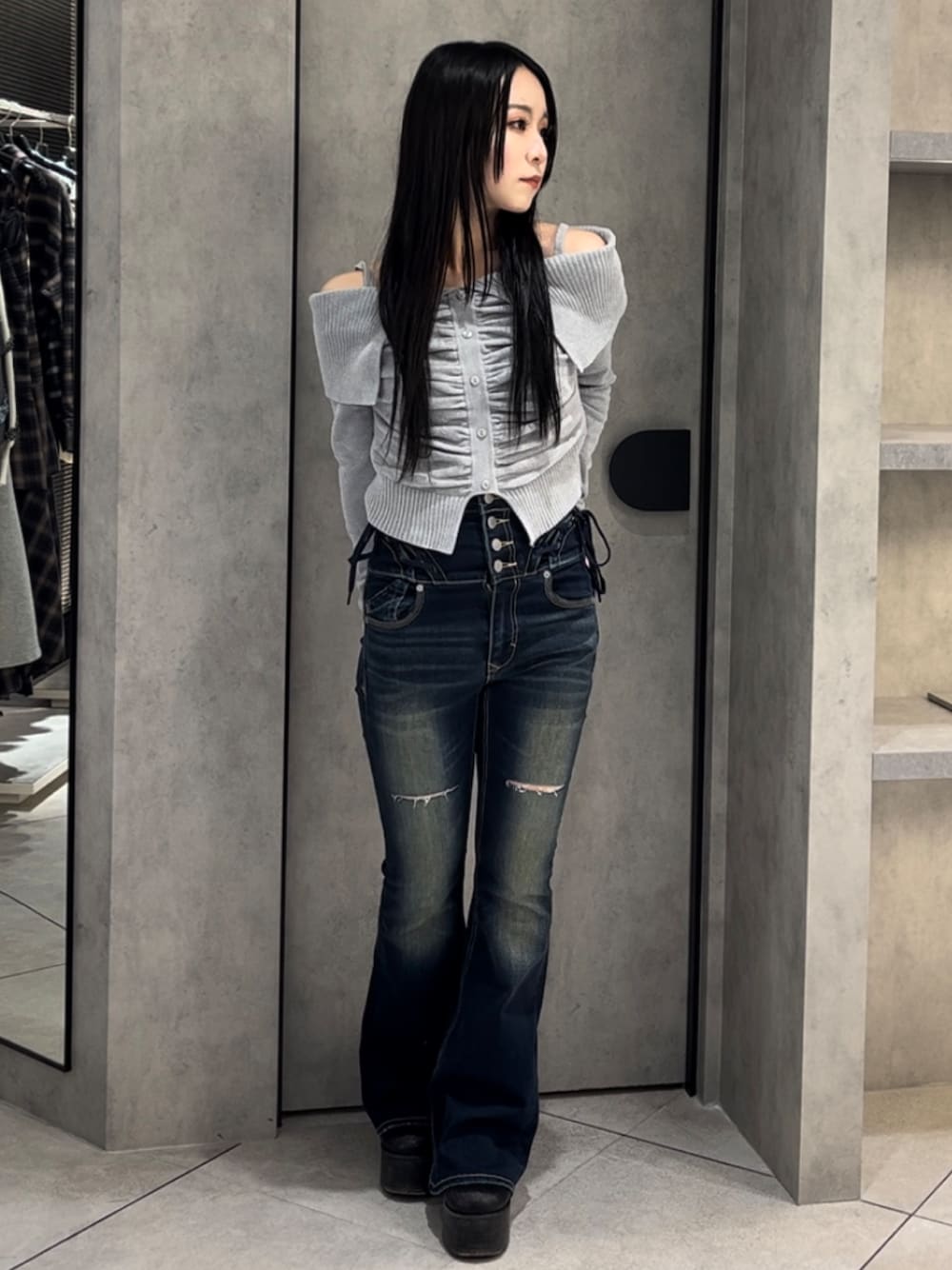 💟TOPS💟 もにゅっとした唯一無二な素材を使ったギャザーオフショルニットです💖 オフショルダーなのに上がってこないのがおすすめのポイント!これならライブでも使えます😻💖 華奢見え、細見えが叶うギャザーデザインもポイント🤍 💟BOTTOMS💟 マイナス5キロデニムのフレアパンツ🥹🖤 ハイウエスト+長めの丈なので、足が8割のスタイルになるのがポイント💗 カーブの編み上げレースデザインが可愛いフレアパンツです🖤膝上の太ももにダメージが入っているので、カジュアルな可愛さがあるのもポイント🥹💖 どのカラーも唯一無二なカラーで、春夏に向けて可愛い色展開です🎶 (XSサイズ着用・少しゆとりあり :ウエスト 56cm・腰骨79cm・ヒップ83cm) 💟BOOTS💟 超足盛れる厚底ブーツです!!💞 S.M.Lでどれも12cm前後のヒールがあるので、スタイル抜群なコーデができます🖤 ヒールですが、底が面になってるので安定性・歩きやすさは抜群です❤️🔥🎶 シンプルなデザインなので、どのコーデにも使えて、デニムパンツもスカートも合わせられるオールラウンダー💖 (普段23.5-24.0cmでMサイズ着用です!)
