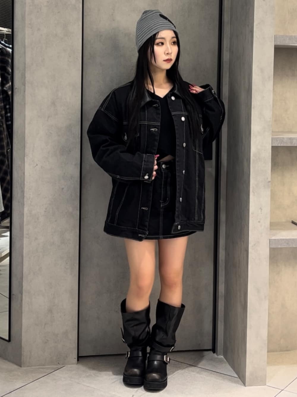 💟FASHION ITEM💟 店頭でも人気なレザーハートのビーニー帽です🖤🖤🖤洗練された雰囲気なので、被るだけでオシャレにしてくれますし、コーデにアクセントを加えたい時にピッタリなアイテムです🤍 頭の形を綺麗に見せてくれるので、どこから見てもかっこよく決まります💖🌟 💟OUTER💟 デニム感や襟のレザーがカジュアルでかっこよく使えるアウターです!🪩 取り外しできるキルティングの中綿が着いているので、まだ寒い春先まではそのまま、少し暖かくなってきたら取り外して使えるので、長い間楽しめます😻🖤 オーバーサイズなのでワイドデニムやミニ丈に合わせるのがオススメです🥹🌟 💟TOPS💟 クロスしたデザインと左下に輝くロゴプレートが可愛いニットです!♥️リブ素材なので着心地や伸縮性もよく、モードな雰囲気を醸し出してくれます🖤 深めにデコルテが見えるタイプのインナーを着てると、意外とインナーが見えないので、EMODAのボックスキャミと合わせるのがおすすめ!💗 💟BOTTOMS💟 人気のデニム生地スカート!🖤台形スカートとタイトスカートの良いとこ取りのようなシルエットでシンプルながら足細みえしてくれます😭💗中にショートパンツ入ってるのも安心!!💗 (身長155cm・ウエスト 56cm・腰骨79cm・ヒップ83cm の私はSサイズ着用! ほんの少しゆとりありました!) 💟BOOTS💟 ギャザーデザインとベルトが可愛いブーツです🥹💖EMODAではめづらしくヒールが少なめで傾斜もほとんどないので、とっても歩きやすいです!!! ギャザーのデザインがコーデにトレンドを取り入れてくれるので、お手持ちのアイテムに合わせてみるのオススメです😻💖 普段23.5-24.0着用でMサイズです!