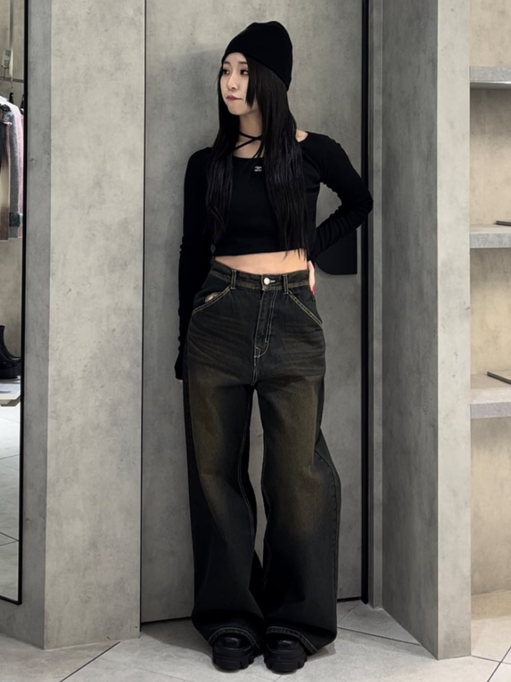 💟TOPS💟 首周りの2WAYチョーカーが可愛いトップスです!お色味もはっきりしたモノトーンや絶妙カラーのイエローなどカラバリ豊富! 若干延びる着心地のいいコットン生地なので、通気性もよく夏前にもピッタリです🪽 首周りのチョーカーは、前にクロスしても後ろにクロスしても可愛いようになってます💖🫶🏻 肩も少し下げてオフショルに出来ます🥺🩷 💟BOTTOMS💟 リボンついたデニムのジャケットとセットアップになってるワイドデニムです!🖤加工感のある色味のため唯一無二でいい風合いなのがポイント🥹💖 サイズを上げてあえて足元を丈長くたるませたり、ウエストもローライズにするのも可愛いです🩷 ウエスト 56cm・腰骨79cm・ヒップ83cmの私はSサイズがちょうどいいです! 💟BOOTS💟 EMODAの王道人気タンクブーツです🖤 ショート丈なので デニムやパンツはもちろん、ミニスカにも合わせられて色んなコーデに使えます🥹♥️♥️ ソールがゴムで安定感もバッチリなので、厚底履きなれない方でも履きやすいブーツです😻🩷 (普段23.5-24.0cmでMサイズ着用) 💟FASHION ITEM💟 店頭でも人気なレザーハートのビーニー帽です🖤🖤🖤洗練された雰囲気なので、被るだけでオシャレにしてくれますし、コーデにアクセントを加えたい時にピッタリなアイテムです🤍 頭の形を綺麗に見せてくれるので、どこから見てもかっこよく決まります💖🌟