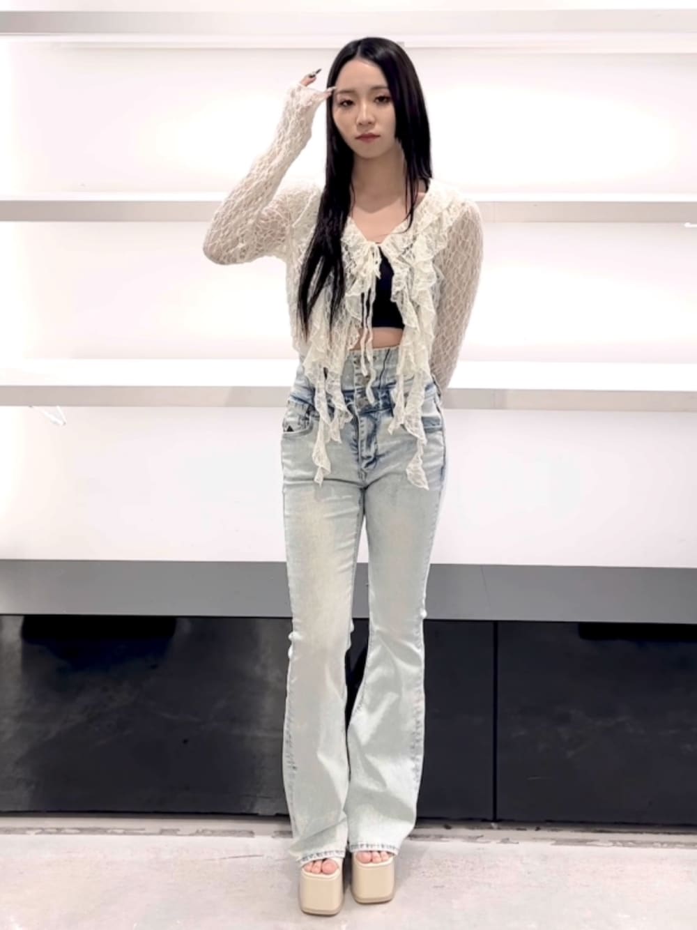 💟TOPS💟 レースの垂れるフリルと、レースについてるシルバーストーンが可愛すぎて大人気のトップス!!リアルバイしたアイテムです🥺💖 羽織って前で止めるようなデザインなので、著脫しやすいのも夏に嬉しいポイント!🌺✨ 手元もスラッと長めなので、腕も長く見える優れもの!デイリー使いはもちろん、アニバーサリーのような特別な日にも使えます😵💫♥️ 💟BOTTOMS💟 EMODAで大人気のマイナス5キロデニム!🥹💖💖💖今回のデザインは、ウォッシュの色合いが可愛いくて、全体的にシンプルなものになってます💙🤍🖤 ヒップなどにボタンのようなドットデザインがあるのもトレンド感あってオススメです!!✨ リアルバイしたアイテムです✨ ウエスト 56cm・腰骨79cm・ヒップ83cmの私はXSサイズがちょうどいいです! 💟SANDAL💟 EMODAで毎年人気な厚底サンダルです💖✨ 圧倒的なヒールの高さと、安定感が持ち味のアイテム!💗フレアパンツなどすらっとしたアイテムに合わせて美脚になるのはもちろん、スカートにそのまま履くのも可愛いです🫶🏻 普段23.5-24.0でMサイズ着用
