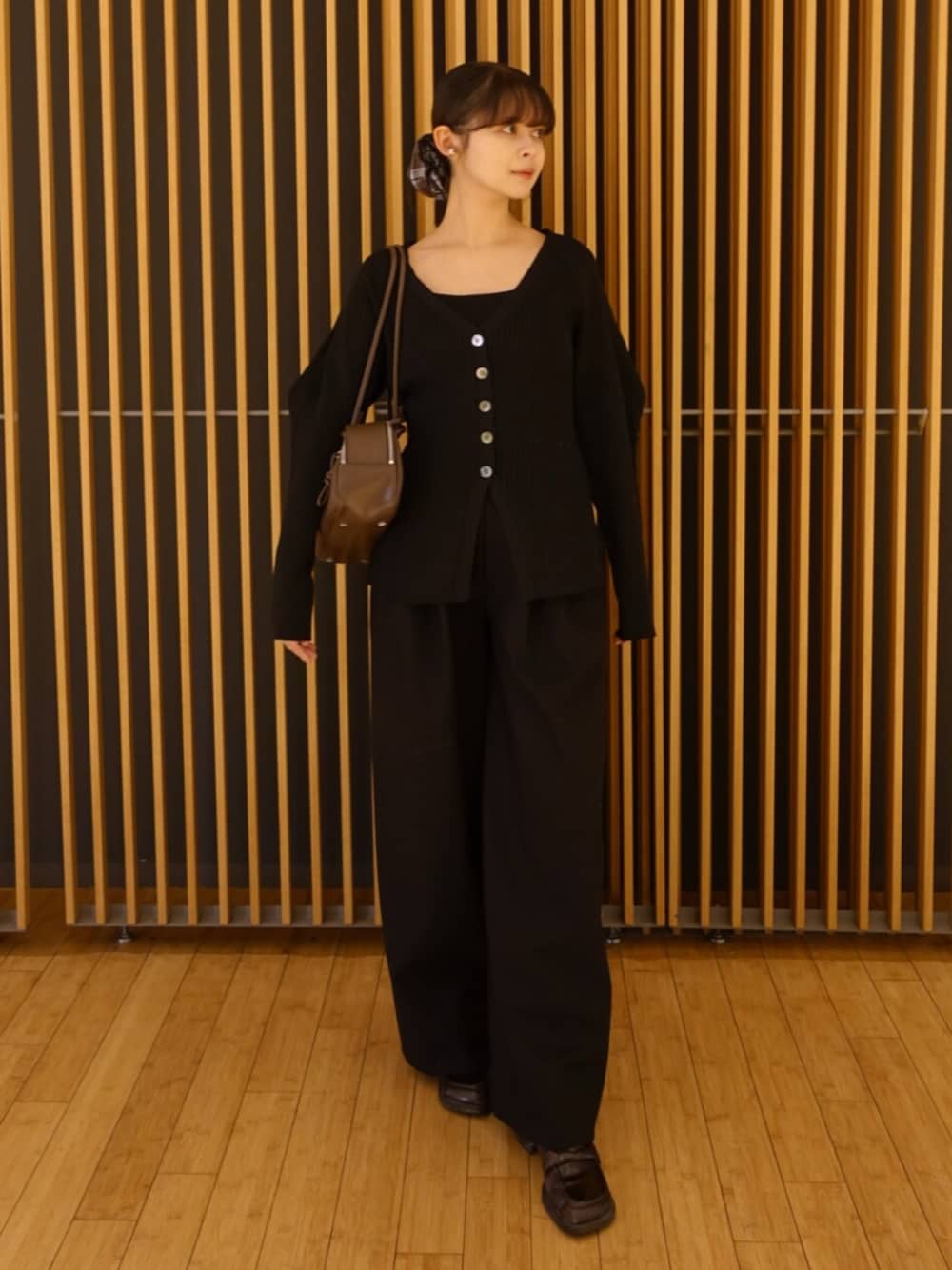 暗すぎないオールブラックコーディネート «ニットアンサンブル» 昨年も大人気だったお洋服☺︎ ウエスト周りの曲線と腕の曲線がとにかく美しく、デコルテも綺麗に見せてくれるところが大好き♡ «ボトムス» しっかりとしたハリ感のある生地に、綺麗なワイドシルエット。 ぴったりとしたトップスから緩めなパーカーまで、なんでも合うので有難いんです! 骨格ウェーブさんは、大好きなはず😏 «バッグ» 昨年発売のチャームボストンバッグ。 小さめに見えますが、ペットボトルやメイクポーチ、小説やスケジュール帳まで入る大容量! 柄の部分も長いので、アウターの上からでも持てるところが有難いです♡