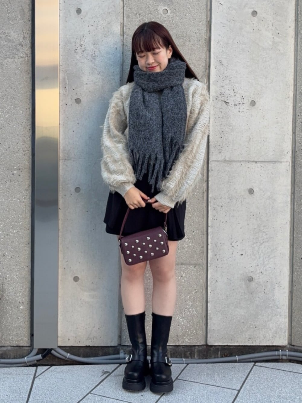 【トップス】 短過ぎない丈感でデザインが可愛いシャギーニット🧶1枚持ってれば間違いなし! 【ボトム】 インナーについてるショートパンツがチラ見えする今トレンドのシルエット! どんなトップスとも相性◎ 【ブーツ】 普通のショートブーツより少し長めのブーツ! 足とフィットするから細見えする⭐︎ ※普段24.5〜25でこのブーツは24.5cmを履いてます 【マフラー】 柔らかくてシンプルなどんなコーデとも相性のいいマフラー🧣
