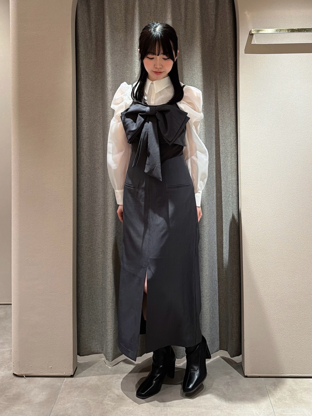 【ワンピース】 おっきなリボンが目を引くガーリー好きには堪らないワンピ👗♥ Iラインのタイトなシルエットだけどウエストくびれてすっきり見え✨️ スリットが入っていて動きやすさも◎ 【トップス】 毎度人気なボウタイブラウス! リボン取り外しできる2WAYなので コーデに合わせて着回しできちゃいます🪞 (今回はリボンなしで𓇬𓂂𓈒) 【ブーツ】 横から見た時のヒールの形がお気に入り🤍 普段23.5cmを履いていてMサイズがぴったりでした!