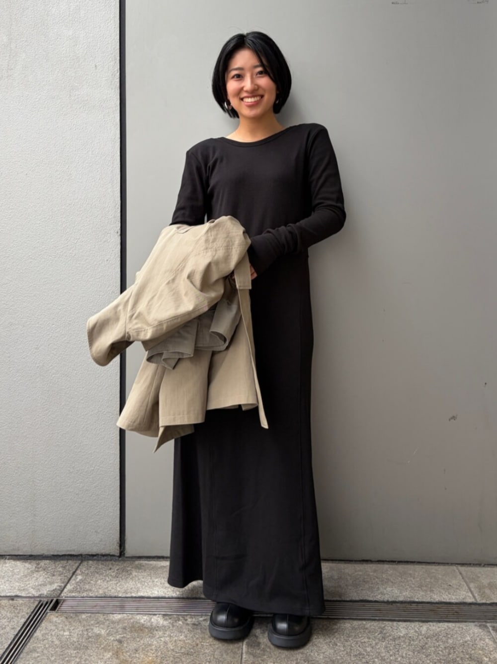【ワンピース】バックオープンデザインがポイント!ヘルシーな肌見せで抜け感も◎ 150cm/Fサイズ着用でも引きずらずに着れます✨️(この丈感待ってた😭) Iラインシルエットで切り替え部分があり、腰位置が高く見えるのもおすすめポイントです!! 生地感はストレッチのあるカットソー素材。 個人差はありますが、体のラインを拾いすぎず着心地も良い! 羽織を羽織っても良し!上からスウェットなどを着てスカートとしても使っても良し!着回し抜群なアイテムです!! 【アウター】羽織るだけでさまになる✨️ 今年トレンドのミドル丈トレンチコート🧥 そのまま羽織るだけでもオシャレ! おすすめの着方はウエストのリボンを腰位置で絞るとスタイルアップにも繋がに小柄さんの方でもバランスよくお楽しみいただけます🍀* カラーも2色展開(カーキ/チャコールグレー)春だけでなく秋も使えます!!