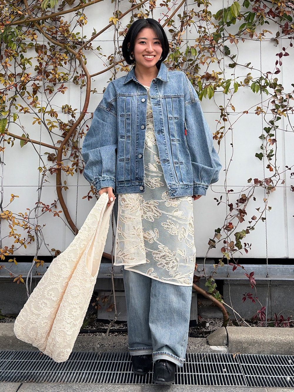 【トップス】ungridのアイコン✨️デニムジャケットから🆕デザイン登場!!! サイズ感や丈感も少しコンパクトになっており、 生地感もっと柔らかく・馴染みやすく・軽くて 心地良い😮💨 150cm/F着用。ヒップが少し隠れるぐらいの丈感で小柄さんの方でもバランス良く使いやすい☝🏻 ̖́ オーバーサイズですが、丸みがありメンズライク過ぎない✨️そしてスッキリ見えるのもおすすめ ポイントです!!! 【スカート】腰に巻いても良し!ワンピース風にしても良し!いつものコーデに➕するだけで上級者✨️マルチ使えるレイヤードアイテムです!! 150cm/F着用。腰に巻いても・ワンピース風にしても丈感、長すぎず丁度いいので小柄さんの方でも安心して使えます😌 メッシュ素材なので涼しく快適にレイヤードスタイルを楽しめます!!