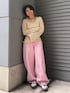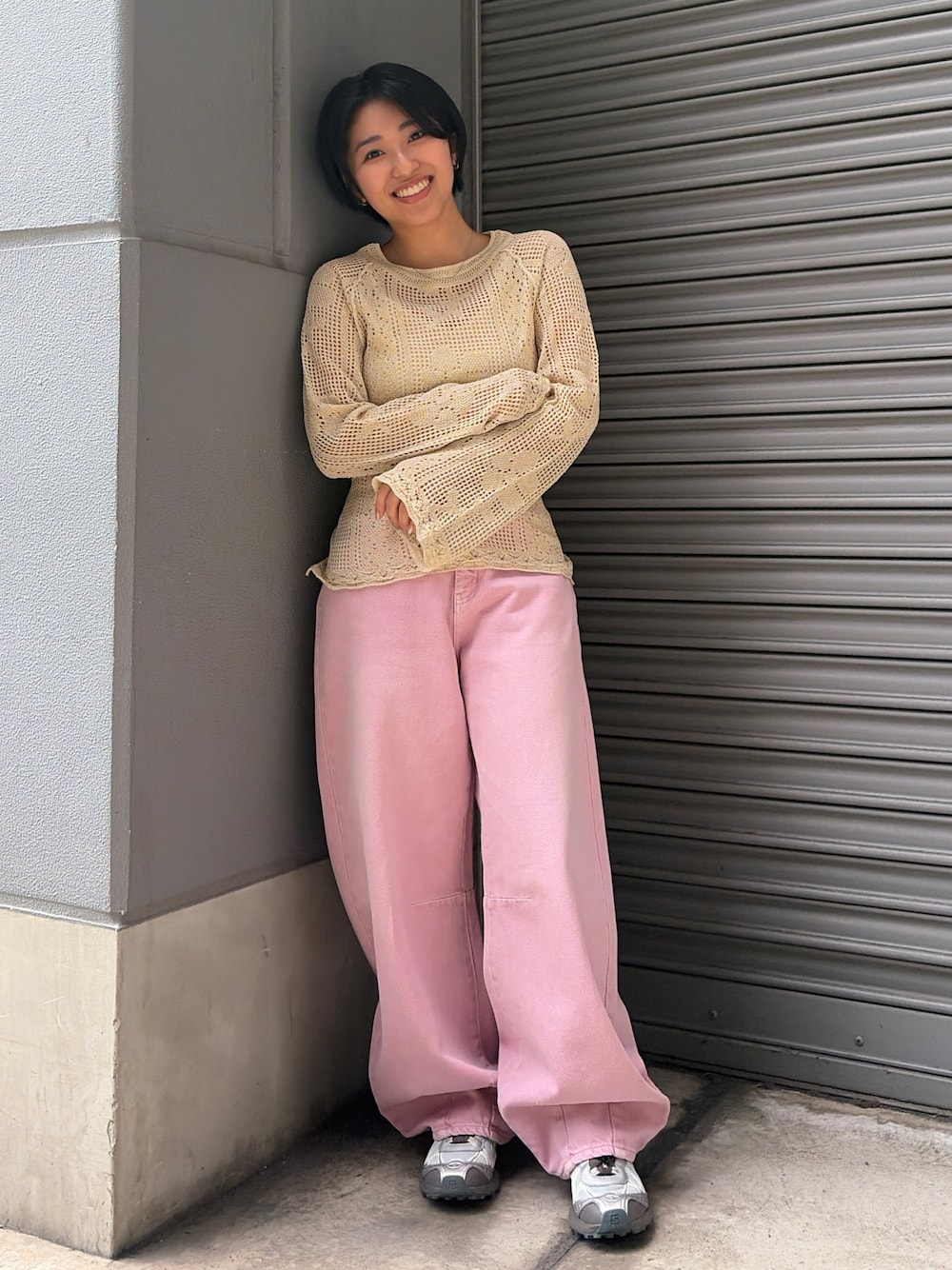 【トップス】大胆なバックスタイルが特徴的! フィットしすぎず、ゆとりがあり着心地も良い○ 150cm/アイボリー/F着用。 生地は綿100%なので、チクチクせず敏感肌の方でも1日不快感なく使用できます。 サイズ感・丈感は長すぎず短すぎずて使いやすい○ フィット感は後ろのレースアップで調節可能です!! 写真では伝わりずらいのですが、2色の糸色紡績された糸を使用しており、古着チックな味わいをお楽しみいただけます!!! 【デニム】思わず目を引くピンク色のカーブシルエットデニム👖 個人的ですが、カーブシルエットデニムの中でもカーブ過ぎず、スッキリとしておりバランスがとりやすい👍 150/ピンク/24inch着用。 ウォッシュ感があり古着ライクで濃すぎ薄すぎす絶妙なピンク色✨️ 生地感は程よくコシ感があり柔らかく動きやすい○ 腰周りもゆったりしているので腰周りが気になる方にもオススメです! 丈感は、約2cm程の厚みのあるスニーカーでギリ裾が着くぐらいだったので、155cm程あるとフラットシューズでもいけそうなぐらいでした!! 小柄さんの方は、後ろの裾1箇所だけ安全ピン等で止めて内側に返すと、カーブシルエットのバランス崩れず裾が溜まりゆったりとしたシルエットでお楽しみいただけます!!