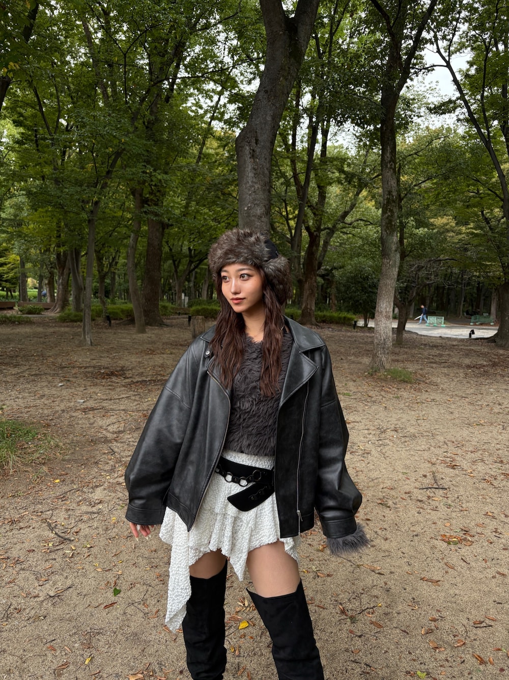 軽くて着心地いいレザージャケットが起きの入り♡ シャギーニットも素材感が柔らかく、チクチクしないところがポイント・:*+