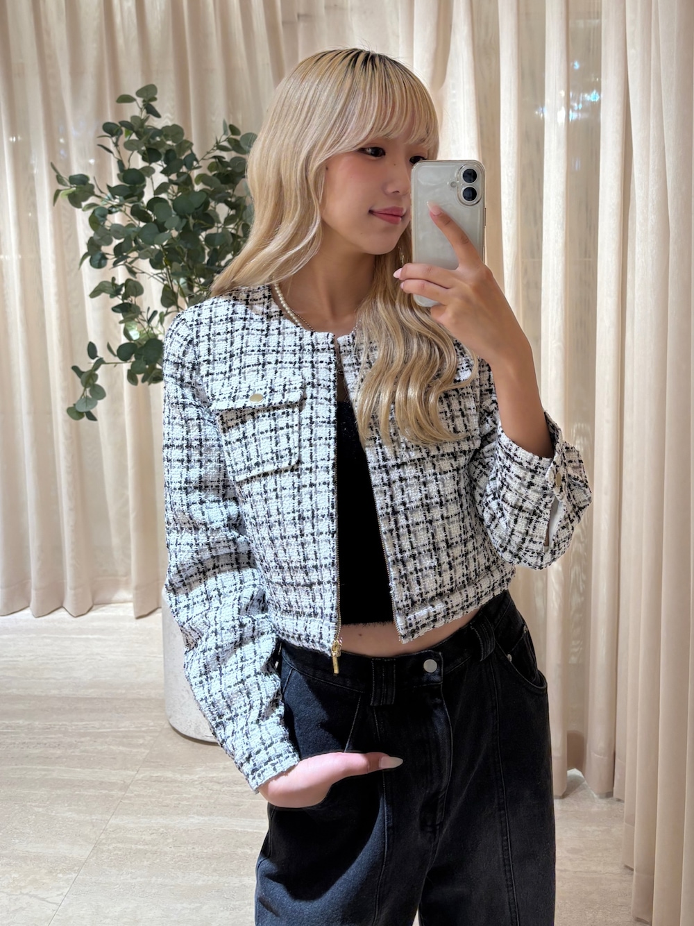 165cm Mサイズ着用 公開から大人気のツイードジャケット🤍 ノーカラーで綺麗めに着るのが好みです