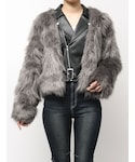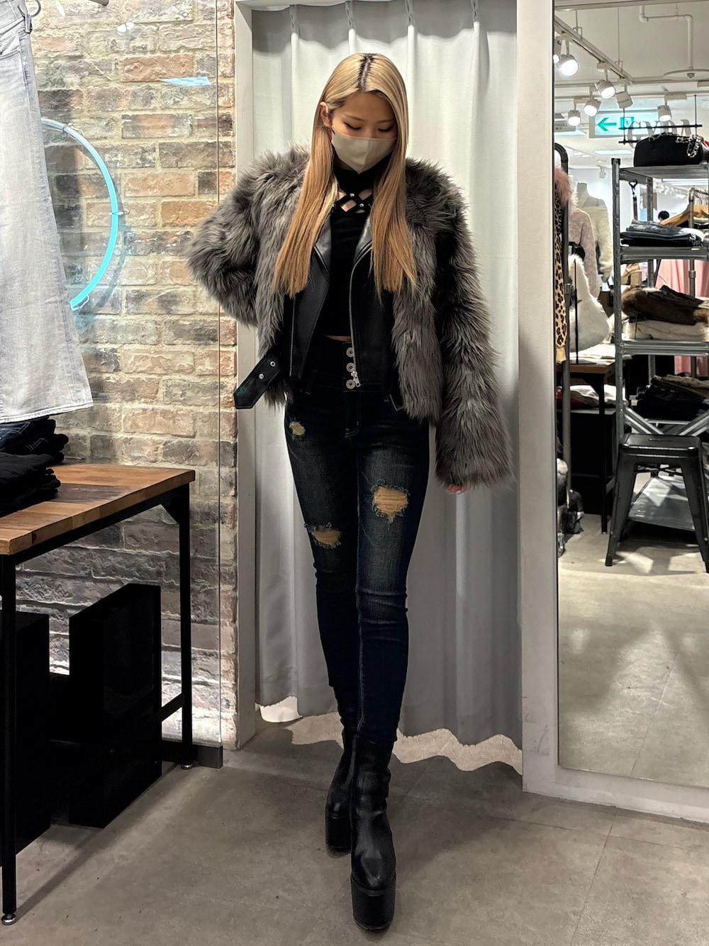 yuna(GYDA)のライダースジャケット「レイヤードエコファーライダースジャケット」を使ったコーディネート