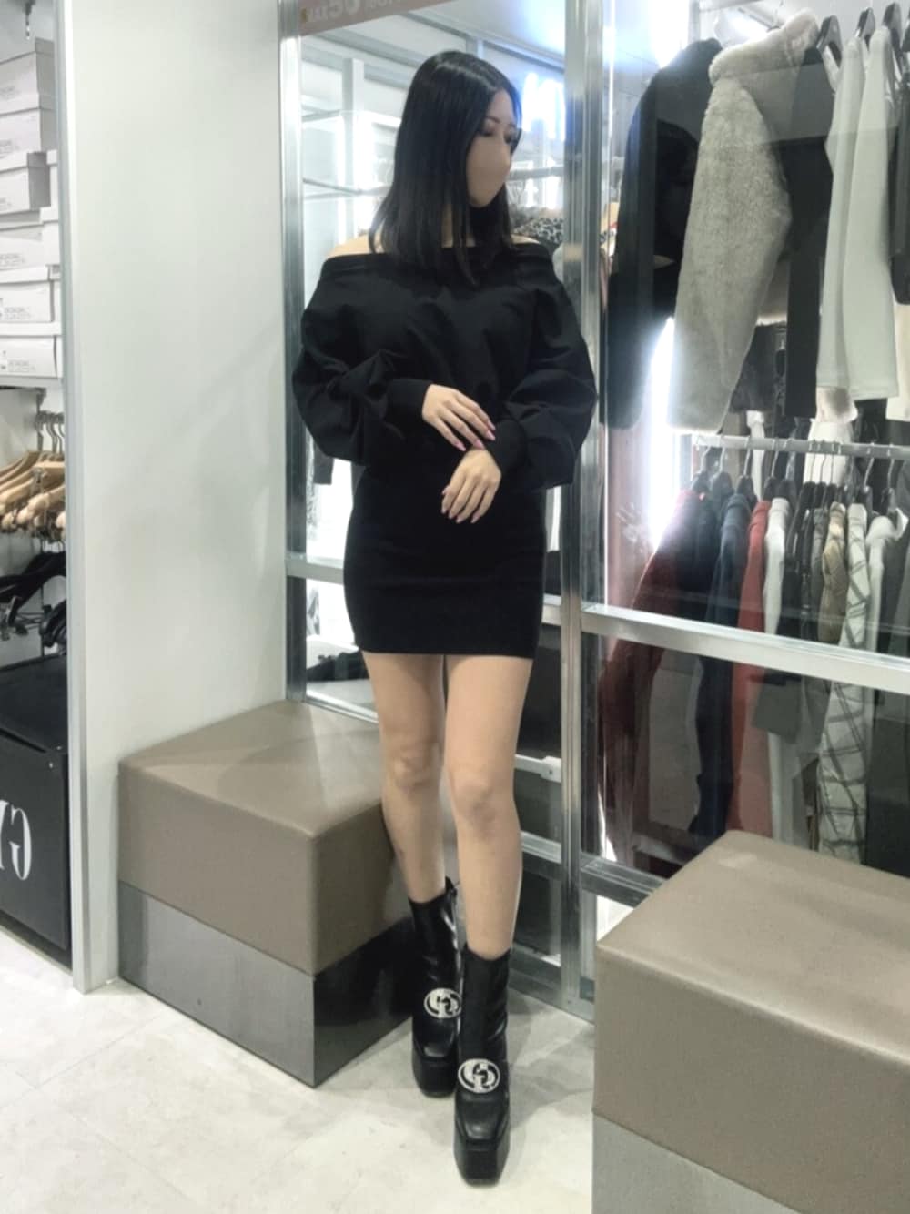 ワンピース スウェット素材で着ていてとても楽ちんです!!オフショルで着るのもかわいいしワンショルにしても可愛いです💖 (166cm、フリーサイズ) ブーツ 厚底になっていてとても安定感があります! ビジューの金具が取り外しできるので2WAYで使えます🎶(24.5cm、Lサイズ)
