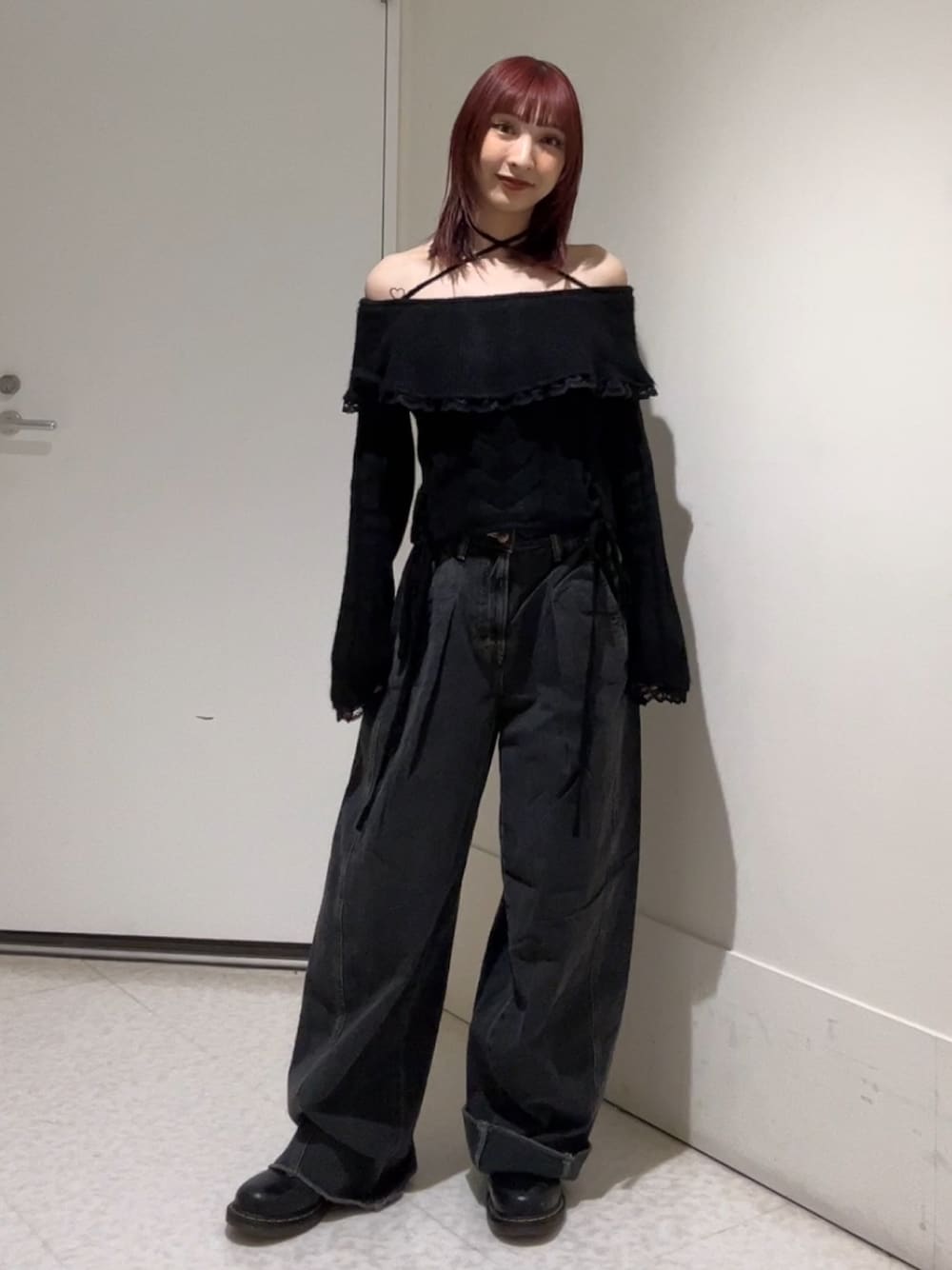 【トップス】オフショルでもオフショルにしなくても使える2WAYタイプのニットで、生地も厚めなので冬でも暖かいです! チョーカーも付いているので首元も寂しくないです! 【デニム】Sサイズでもゆったりサイズなのとシルエットもワイドなのでメンズライクやカジュアル系統が好きな方におすすめです! 裾を溜めて履くのが今っぽくて可愛いです