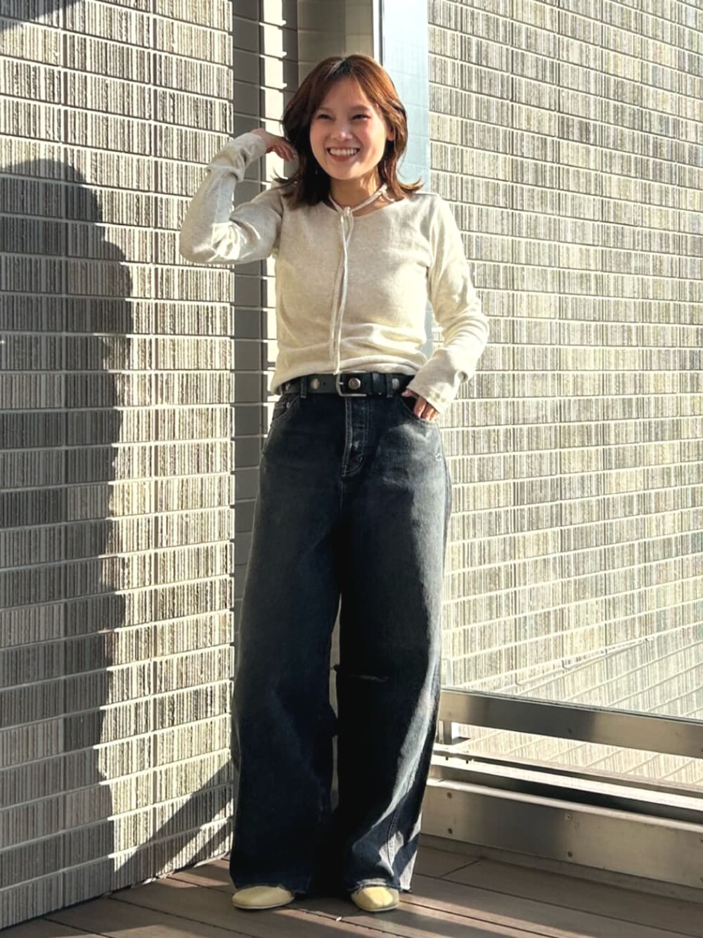 【トップス】 首元の紐デザインがアクセントになるトップス🩷結び方によって雰囲気が変わるので飽きずに着れるトップスです✨ 首が短い私でも紐が細めなので、巻いてもスッキリ着れました☺️ 【デニム】 体のラインを拾わないゆったりとしたサイズで、所々ダメージ加工がありますが、さりげなくはいっているので、大人の方でも履きやすいデニムです🌟 153cmの身長で24インチ履いて、3cmのシューズ履いて、ギリギリ床につかないくらいでした◎ 【シューズ】 落ち着いたイエローで春っぽく、コーデに取り入れやすいです🌼 クッションがきいていて、ヒールなのに履き心地最高です👌🏻 普段靴のサイズは23cmでSサイズでピッタリでした◎