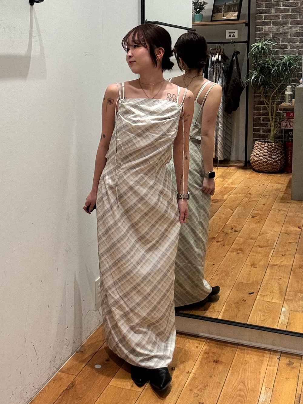 阿部いろは(Ungrid)のワンピース「バックデザインチェックキャミワンピース」を使ったコーディネート