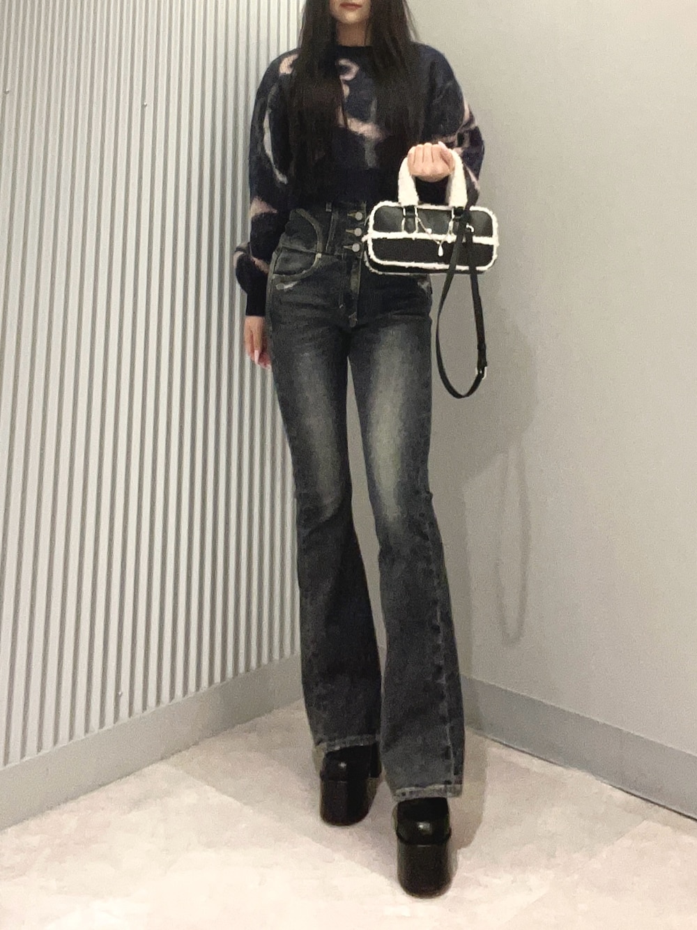 高岸寧香(EMODA)のデニムパンツ「スーパーハイウエストフレアパギンス」を使ったコーディネート