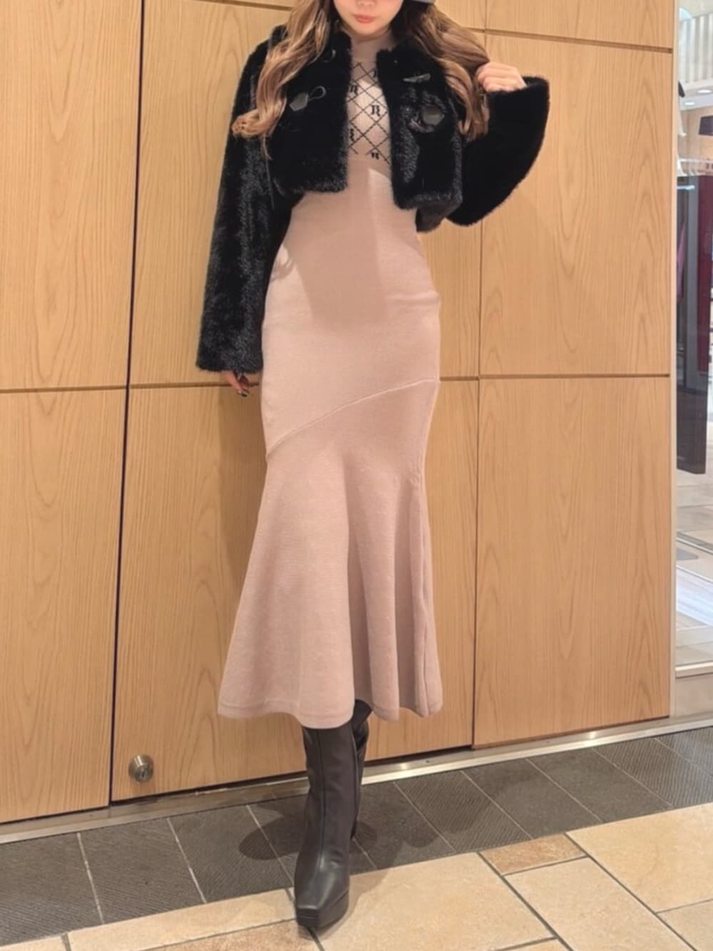 シルエットがとても綺麗になるマーメイドワンピースです♡後ろがリボンになっていて、前の ロゴマークがバスト辺りで切り替えになっているので、足長効果になります🤩 低身長の方も安心してきていただけるマーメイドワンピースです♡ ショート丈のブルゾンを合わせることにより、スタイルアップするのでショート丈のアウター、ブルゾン合わせがおすすめです✨ ピンヒールなどを合わせて履いていただくと、さらに綺麗にスタイルアップします🤩
