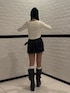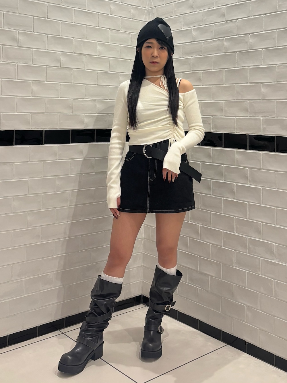 【トップス】 首元がチョーカーになってるニット🎀 ギャザーの部分は自分で調整可能なので丈感も変えられちゃいます🤍 【ボトムス】 シンプルなデニムスカートで着回し抜群です! 中にパンツも付いてるのでミニスカートでも安心😌 【シューズ】 EMODAでは珍しい低めのヒール約6cmでとても歩きやすいです🙆🏻♀️ ミニボトムとの相性が抜群なので1足は持っておきたいブーツ🥾 23.5cmでMサイズ着用